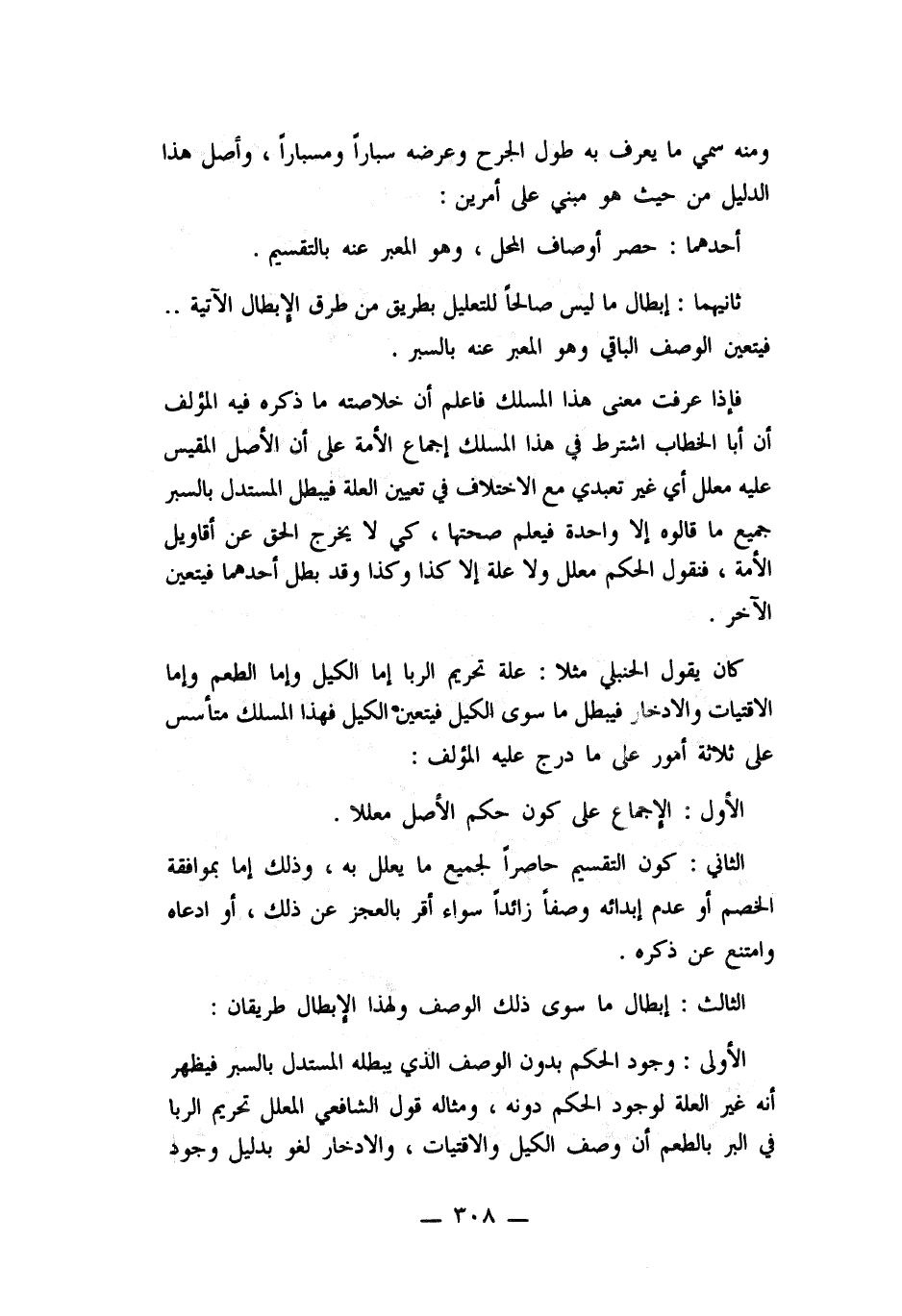 كان يقول الحنبلي مثلا: علة تحريم الربا أما الكيل وأما الطعم وأما الاقتيات والإدخار فيبطل ما سوى الكيل فيتعين الكيل فهذا المسلك متأسس على ثلاثة أمور على ما درج عليه المؤلف: