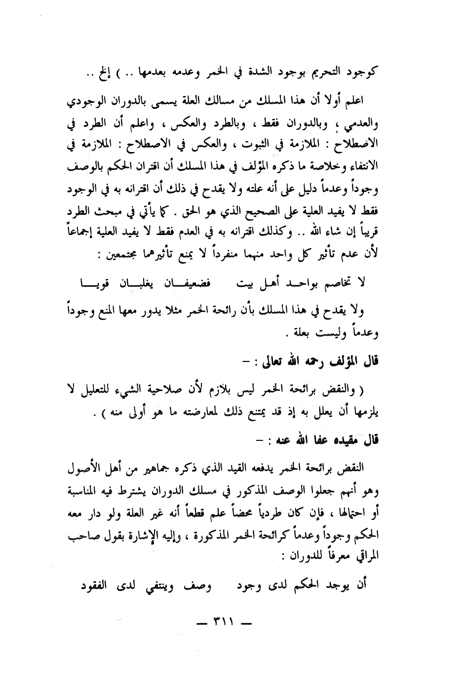 اعلم أولا أن هذا المسلك من مسالك العلة يسمى بالدوران الوجودي والعدمي، وبالدوران فقط، وبالطرد والعكس في الاصطلاح: الملازمة في الانتفاء وخلاصة ما ذكره المؤلف في هذا المسلك أن اقتران الحكم بالوصف وجوداً وعدماً دليل على أنه علته، ولا يقدح في ذلك أن اقترانه به في الوجود فقط لا يفيد العلية على الصحيح الذي هو الحق. كما يأتي في مبحث الطرد قريباً ان شاء الله.. وكذلك اقترانه به في العدم فقط لا يفيد العلية اجماعاً لأن عدم تأثير كل واحد منهما منفرداً لا يمنع تأثيرهما مجتمعين: