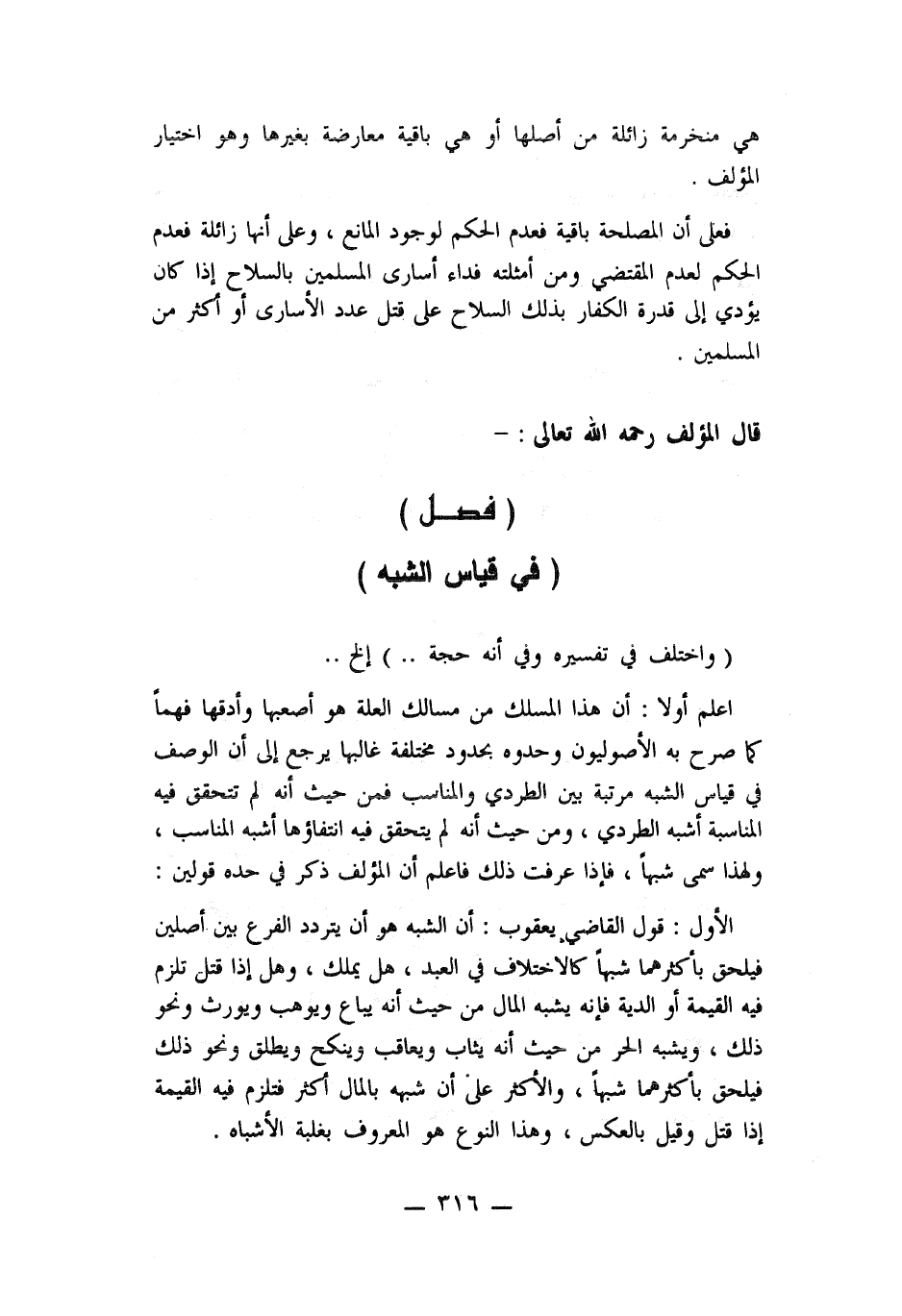 الأول: قول القاضي يعقوب: أن الشبه هو أن يتردد الفرع بين أصلين فيلحق بأكثرهما شبهاً كالاختلاف في العبد، هل يملك، وهل إذا قتل تلزم فيه القيمة أو الدية فانه يشبه المال من حيث أنه يباع ويوهب ويورث ونحو ذلك، ويشبه الحر من حيث أنه يثاب ويعاقب وينكح ويطلق ونحو ذلك فيلحق بأكثرهما شبهاً، والأكثر على أن شبهه بالمال أكثر فتلزم فيه القيمة إذا قتل وقيل بالعكس، وهذا النوع هو المعروف بغلبة الأشباه.