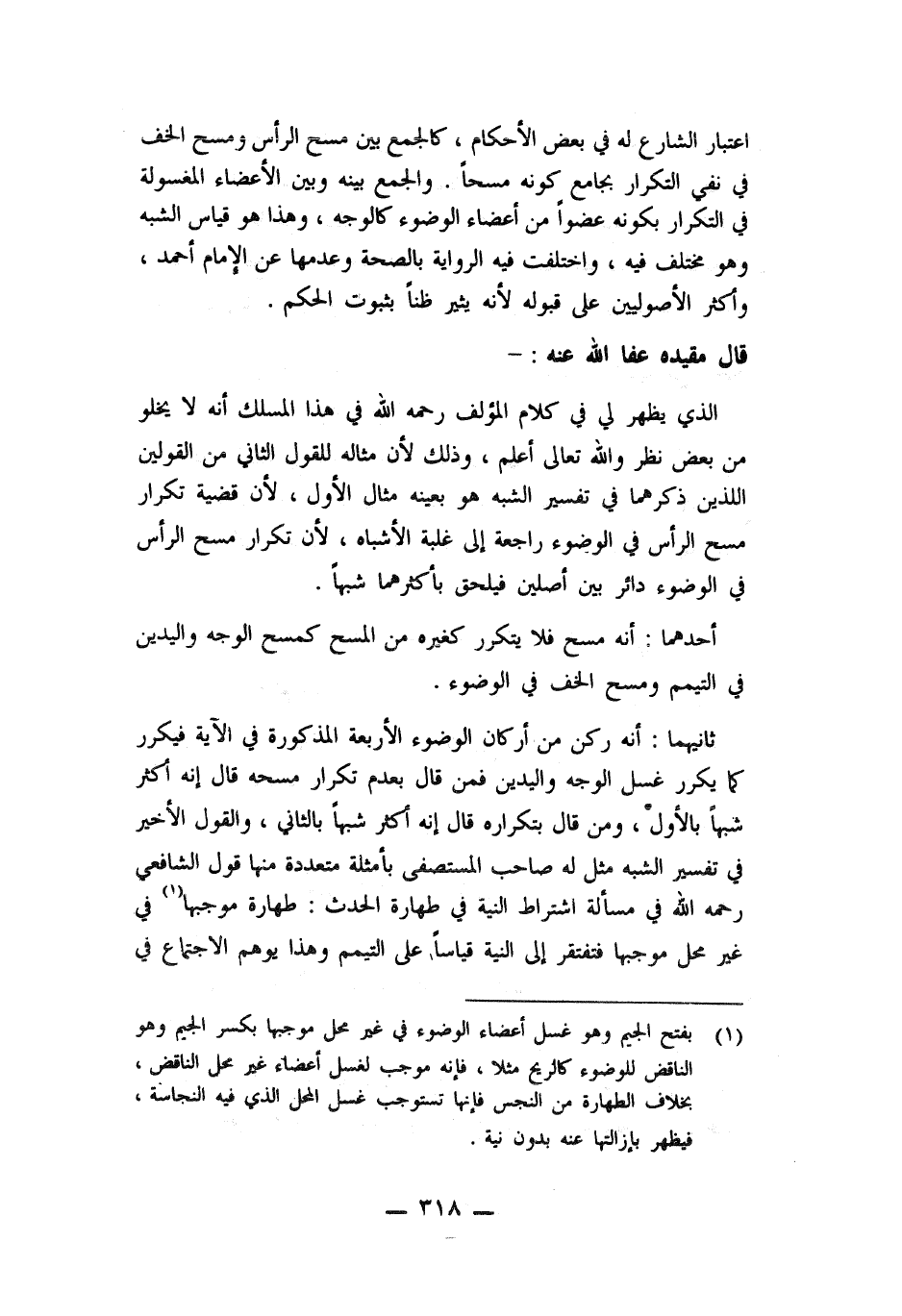 ثانيهما: أنه ركن من أركان الوضوء الأربعة المذكورة في الآية فيكرر كما يكرر غسل الوجه واليدين فمن قال بعدم تكرار مسحه قال أنه أكثر شبها بالأول، ومن قال: بتكراره قال أنه أكثر شبهاً بالثاني، والقول الأخير في تفسير الشبه مثل له صاحب المستصفى بأمثلة متعددة منها قول الشافعي رحمه لله في مسألة اشتراط النية في طهارة الحدث: طهارة موجبها (¬1) في غير محل موجبها فتفتقر إلى النية قياساً على التيمم وهذا يوهم الاجتماع في