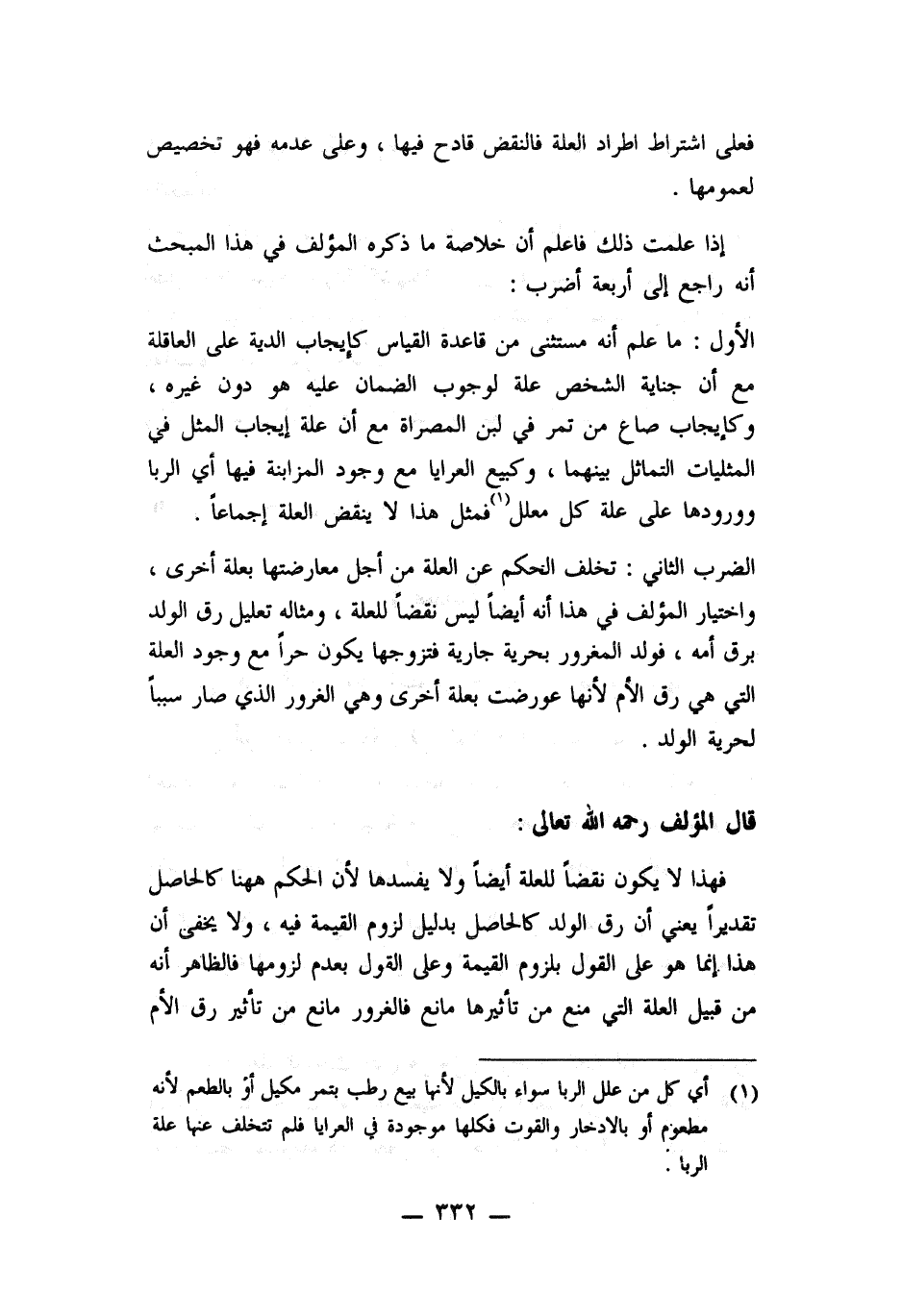 الضرب الثاني: تخلف الحكم عن العلة من أجل معارضتها بعلة أخرى، واختيار المؤلف في هذا أنه أيضاً ليس نقضاً للعلة، ومثاله تعليل رق الولد برق أمه، فولد المغرور بحرية جارية فتزوجها يكون حراً مع وجود العلة التي هي رق الأم لأنها عورضت بعلة أخرى وهي الغرور الذي صار سبباً لحرية الولد.