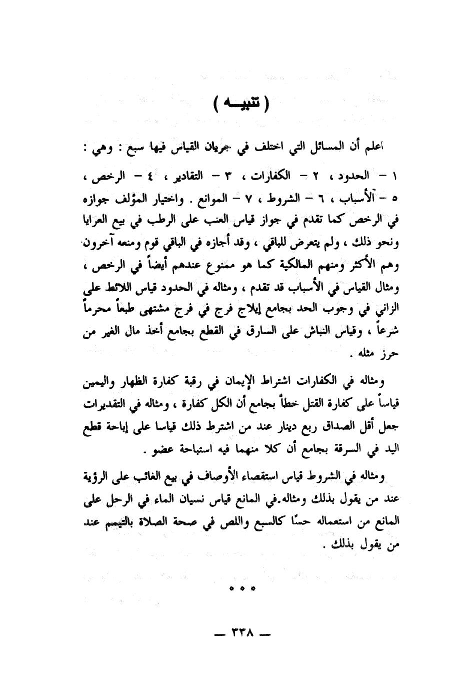 1- الحدود، 2- الكفارات، 3- التقادير، 4- الرخص، 5- الأسباب، 6- الشروط، 7- الموانع. واختيار المؤلف جوازه في الرخص كما تقدم في جواز قياس العنب على الرطب في بيع العرايا ونحو ذلك، ولم يتعرض للباقي، وقد أجازه في الباقي قوم ونعه آخرون وهم الأكثر ومنهم المالكية كما هو ممنوع عندهم أيضاً في الرخص، ومثال القياس في الأسباب قد تقدم، ومثاله في الحدود قياس اللائط على الزاني في وجوب الحد بجامع ايلاج الفرج في فرج مشتهي طبعاً محرماً شرعاً، وقياس النباش على السارق في القطع بجامع أخذ مال الغير من حرز
