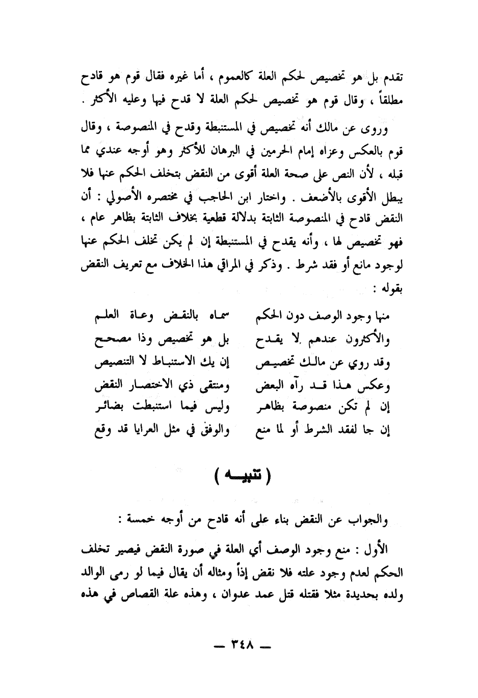 وروي عن مالك أنه تخصيص في المستنبطة وقدح في المنصوصة، وقال قوم بالعكس وعزاه امام الحرمين في البرهان للأكثر وهو أوجه عندي مما قبله، لأن النص على صحة العلة أقوى من النقض بتخلف الحكم عنها فلا يبطل الأقوى بالأضعف. واختار ابن الحاجب في مختصره الأصولى: أن النقض قادح في المنصوصة الثابتة بدلالة قطعية بخلاف الثابتة بظاهر عام، فهو تخصيص لها، وأنه يقدح في المستنبطة أن لم يكن تخلف الحكم عنها لوجود مانع أو فقد شرط. وذكر في المراقي هذا الخلاف مع تعريف النقض بقوله: