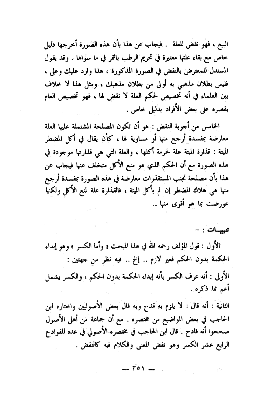 الخامس من أجوبة النقض: هو أن تكون المصلحة المشتملة عليها العلة معارضة بمفسدة أرجح منها مساوية لها، كأن يقال في أكل المضطر الميتة: قذارة الميتة علة لحرمة أكلها، والعلة التي هي قذارتها موجودة في هذه الصورة مع أن الحكم الذي هو منع الأكل متخلف عنها فيجاب عن هذا بأن مصلحة تجنب المستقذرات معارضة في هذه الصورة بمفسدة أرجح منها هي هلاك المضطر ان لم يأكل الميتة، فالقذارة علة لمنع الأكل ولكنها عورضت بما هو أقوى منها. .