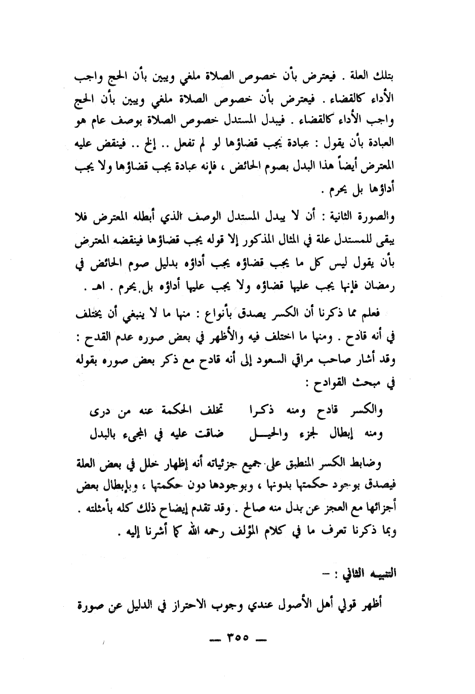 والصورة الثانية: أن لا يبدل المستدل الوصف الذي أبطله المعترض فلا يبقى للمستدل علة في المثال المذكور الا قوله يجب قضاؤها فينقضه المعترض بأن يقول ليس كل ما يجب قضاؤه يجب أداؤه بدليل صوم الحائض في رمضان فنها يجب عليها قضاؤه ولا يجب عليها أداؤه بل يحرم. هـ.