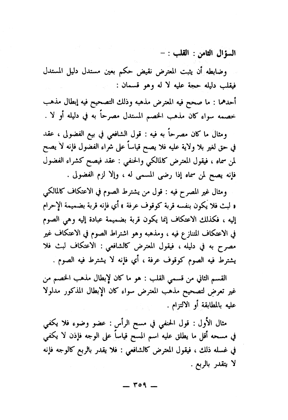 ... ومثال غير المصرح فيه: قول من يشترط الصوم في الاعتكاف كالمالكي " لبث فلا يكون بنفسه قربة كوقوف عرفة " أي فانه قربة بضميمة الإحرام أليه، فكذلك الاعتكاف إنما يكون قربة بضميمة عباده إليه وهي الصوم في الاعتكاف المتنازع فيه، ومذهبه وهو اشتراط الصوم في الاعتكاف غير مصرح به في دليله، فيقول المعترض كالشافعي: الاعتكاف لبث فلا يشترط فيه الصوم كوقوف عرفة، أي فانه لا يشترط فيه الصوم.