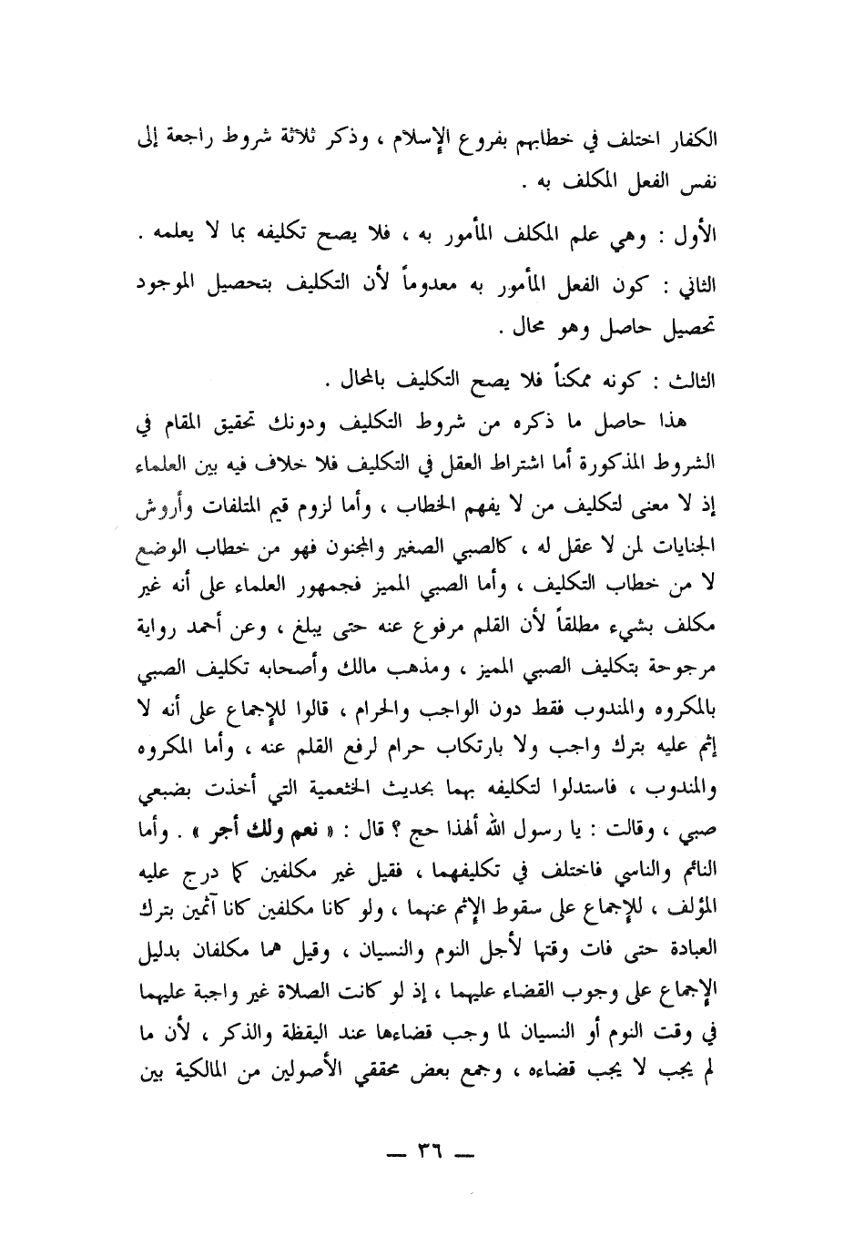 هذا حاصل ما ذكره من شروط التكليف ودونك تحقيق المقام فى الشروط المذكورة أما اشتراط العقل فى التكليف فلا خلاف فيه بين العلماء اذ لا معنى لتكليف من لا يفهم الخطاب، وأما لزوم قيم المتلفات وأروش الجنايات لمن لا عقل له، كالصبى الصغير والمجنون فهو من خطاب الوضع لا من خطاب التكليف، وأما الصبى المميز فجمهور العلماء على أنه غير مكلف بشيء مطلقاً لأن القلم مرفوع عنه حتى يبلغ، وعن أحمد رواية مرجوحة بتكليف الصبى المميز، ومذهب مالك وأصحابه تكليف الصبى بالمكروه والمندوب فقط دون الواجب والحرام، قالوا