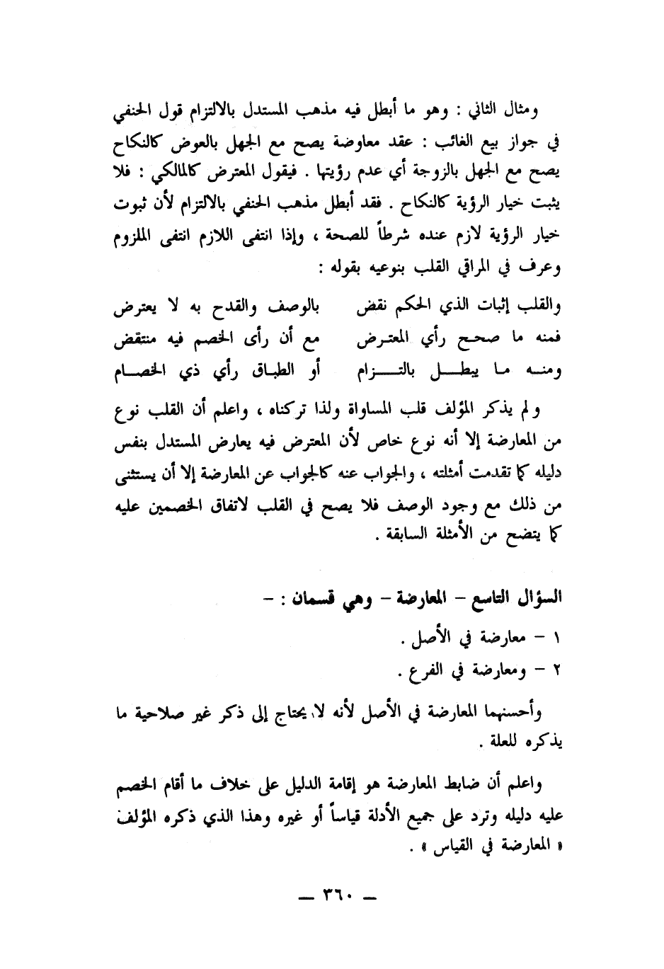 .. ومثال الثاني ك وهو ما أبطل فيه مذهب المستدل بالالتزام قول الحنفي في جواز بيع الغائب: عقد معاوضة يصح مع الجهل بالعوض كالنكاح يصح مع الجهل بالزوجة أي عدم رؤيتها. فيقول كالمالكي: فلا يثبت خيار الرؤية كالنكاح. فقد أبطل مذهب الحنفي بلالتزام لأن ثبوت خيار الرؤية لازم عنده شرطاً للصحة، وإذا انتفى اللازم انتفى الملزوم وعرف في المراقي القلب بنوعيه بقوله: