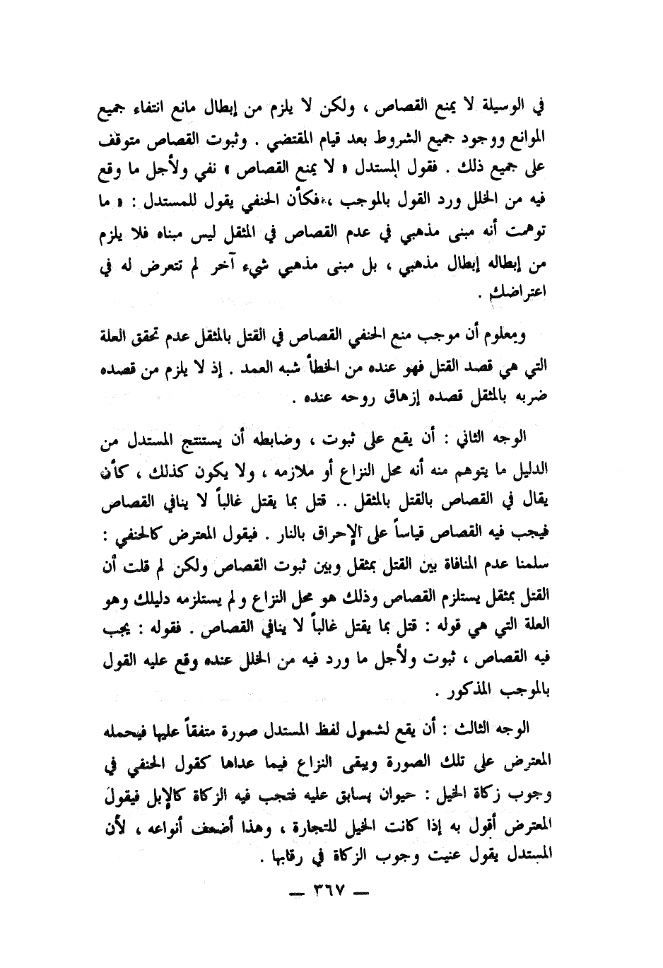 في الوسيلة لا يمنع القصاص، ولكن لا يلزم من إبطال مانع انتفاء جميع الموانع ووجود جميع الشروط بعد قيام المقتضي. وثبوت القصاص متوقف على جميع ذلك. فقول المستدل " لا يمنع القصاص " نفي ولأجل ما وقع فيه من الخلل ورد القول بالموجب، فكأن الحنفي يقول للمستدل: " ما توهمت أنه مبنى مذهبي، بل مبنى مذهبي شيء آخر لم تتعرض له في اعتراضك.