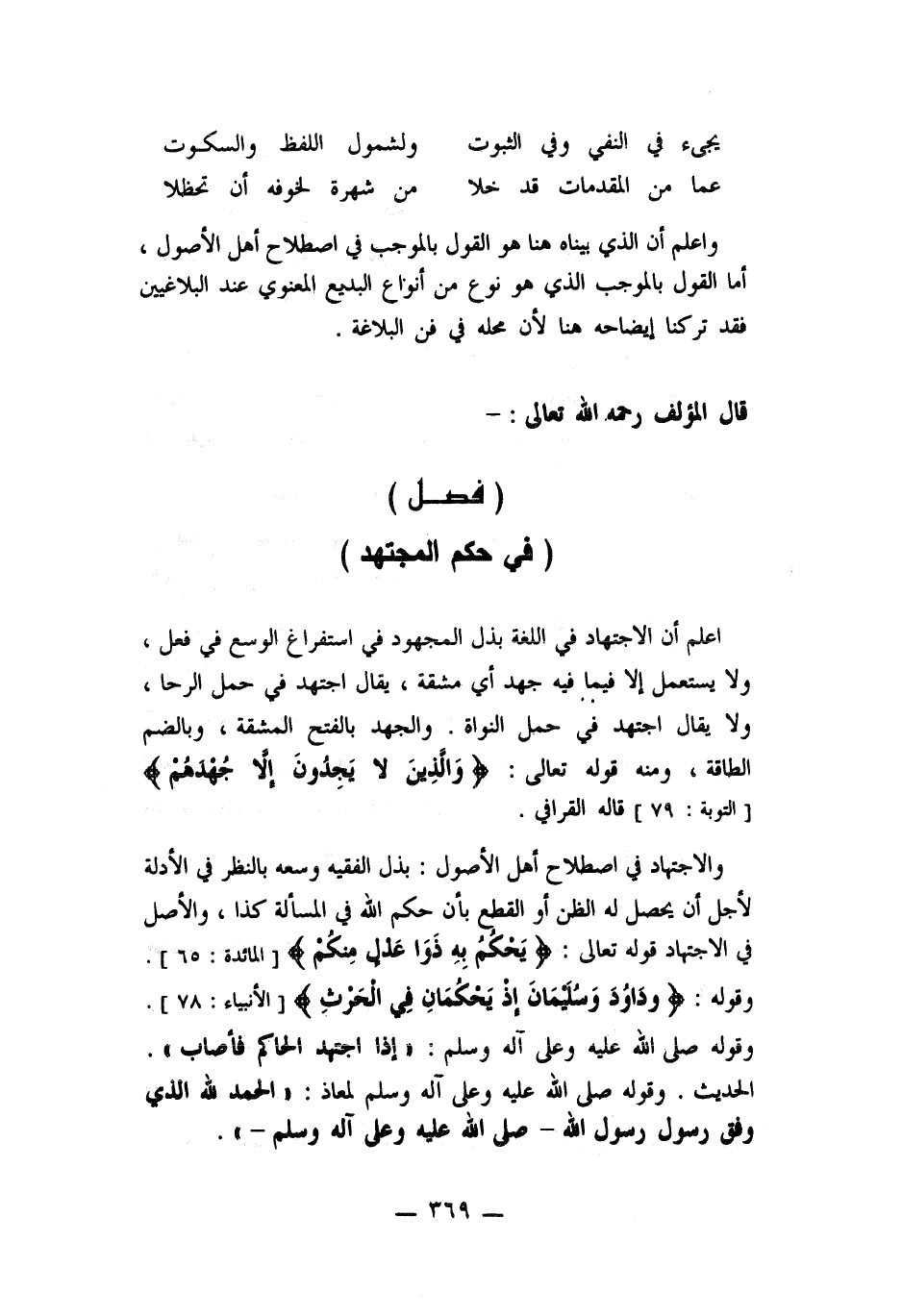 ... والاجتهاد في اصطلاح أهل الأصول: بذل الفقيه وسعه بالنظر في الأدلة لأجل أن يحصل له الظن أو القطع بأن حكم الله في المسألة كذا، والأصل في الاجتهاد قوله تعالى: " يحكم به ذوا عدل منكم ". وقوله وداودود وسليمان إذ يحكمان في الحرث ".