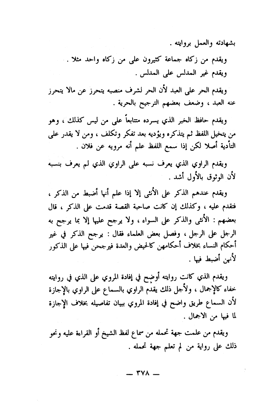 ... ويقدم عندهم الذكر عن الأنثى إلا إذا علم أنها أضبط من الذكر, فتقدم عليه، وكذلك أن كانت صاحبة القصة قدمت على الذكر، قال بضعهم: الأنثى والذكر على السواء، ولا يرجح عليها إلا بما يرجح به الرجل على الرجل، وفصل بعض العلماء فقال: يرجح الذكر