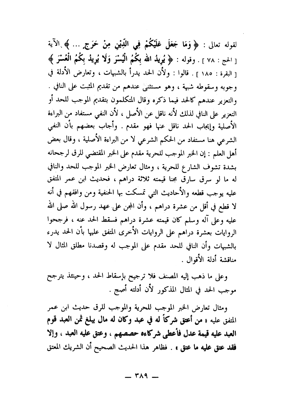 وقال المتكلمون بتقديم الموجب للحد أو التعزير على النافي لذلك لأنه ناقل عن الأصل، لأن النفي مستفاد من البراءة الأصلية وايجاب الحد ناقل عن الأصل، لأن النفي مستفاد من البراءة الأصلية وإيجاب الحد ناقل عنها فهو مقدم. وأجاب بعضهم بأن النفي الشرعي هنا مستفاد من الحكم الشرعي لا من البراءة الأصلية، وقال بعض أهل العلم: أن الخبر الموجب للحرية مقدم على الخبر المقتضي للرق لرجحانه بشدة تشوف الشارع للحرية، ومثال تعارض الخبر الموجب للحد والنافي له ما لو سرق سارق مجنا قيمته ثلاثة دراهم، فحديث ابن عمر
