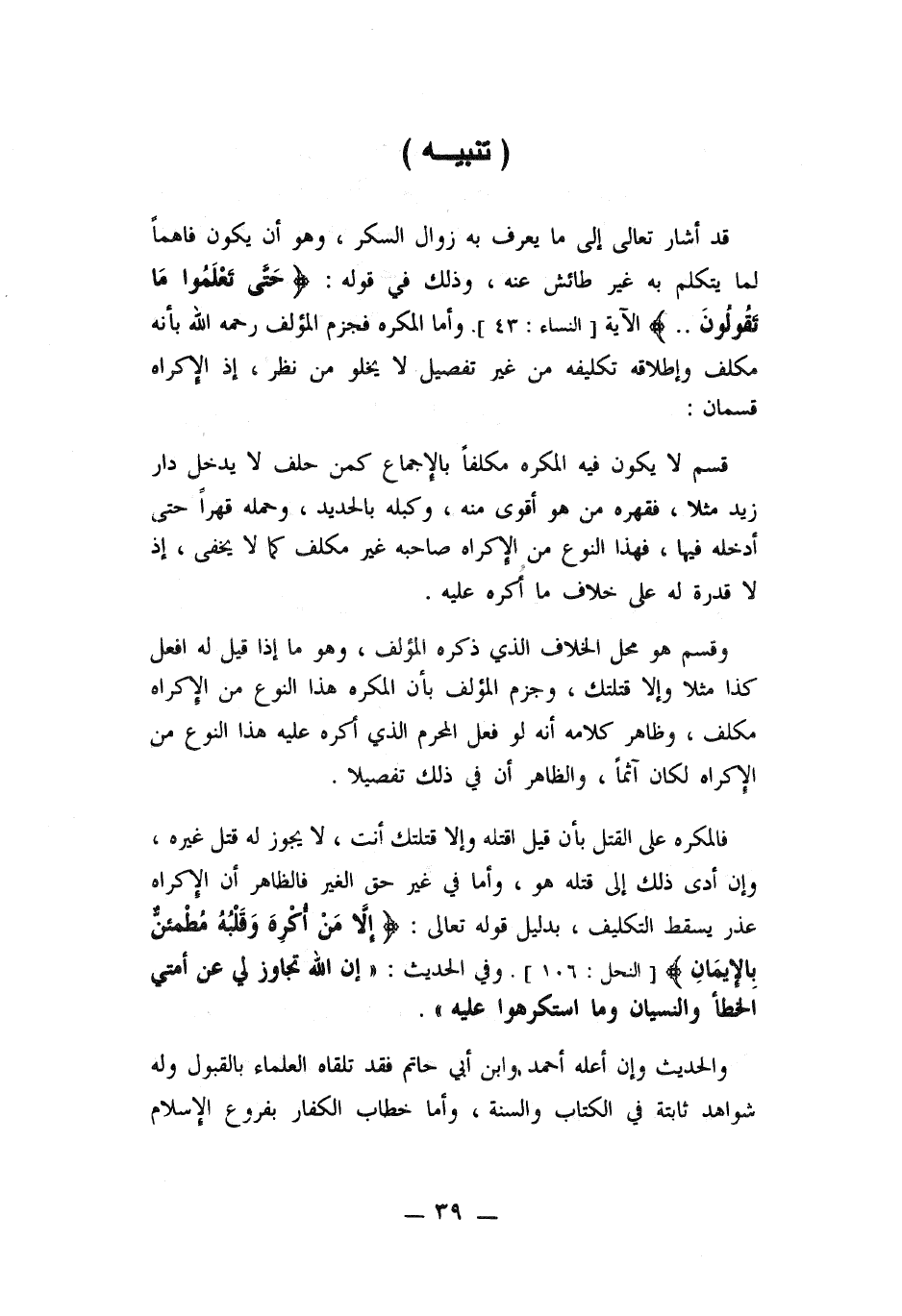 قد أشار تعالى إلى ما يعرف به زوال السكر، وهو أن يكون فاهماً لما يتكلم به غير طائش عنه، وذلك فى قوله " حتى تعلموا ما تقولون..) الآية. وأما المكره فجزم المؤلف رحمه الله بأنه مكلف واطلاقه تكليفه من غير تفصيل لا يخلو من نظر، اذ الاكراه قسمان: