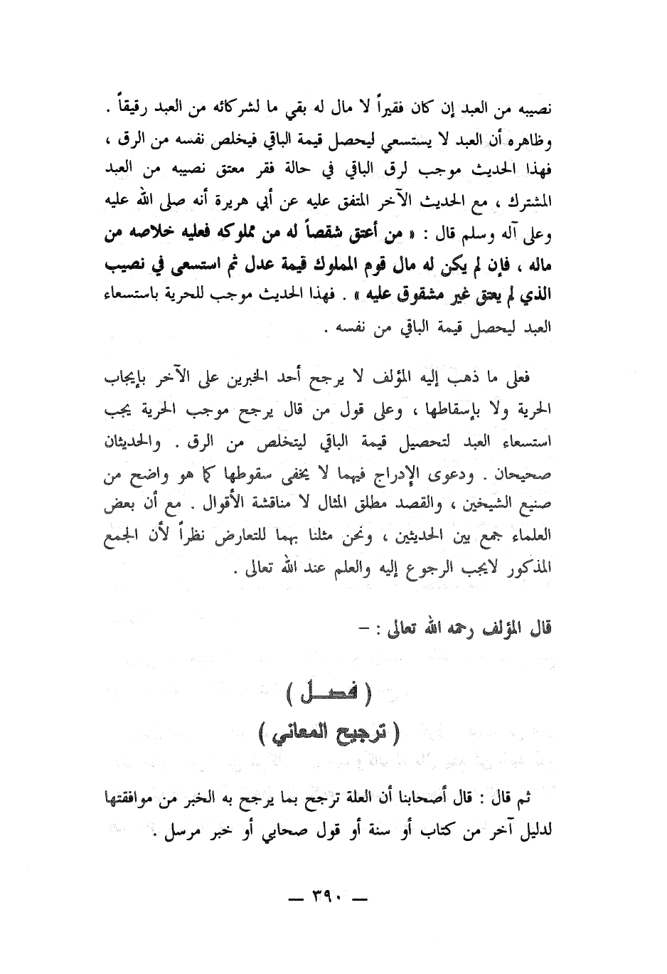 وظاهره أن العبد لا يستسعي ليحصل قيمة الباقي فيخلص نفسه من الرق، فهذا الحديث موجب لرق الباقي في حالة فقر معتق نصيبه من العبد المشترك، مع الحديث الآخر المتفق عليه عن أبي هريرة أنه صلى الله عليه وسلم قال: من أعتق شخصاً له من مملوكه فعليه خلاصه من ماله، فان لم يكن له مال قوم المملوك قيمة عدل ثم استسعى في نصيب الذي لم يستق غير مشقوق عليه. فهذا الحديث موجب للحرية باستسعاء العبد ليحصل قيمة الباقي من نفسه.