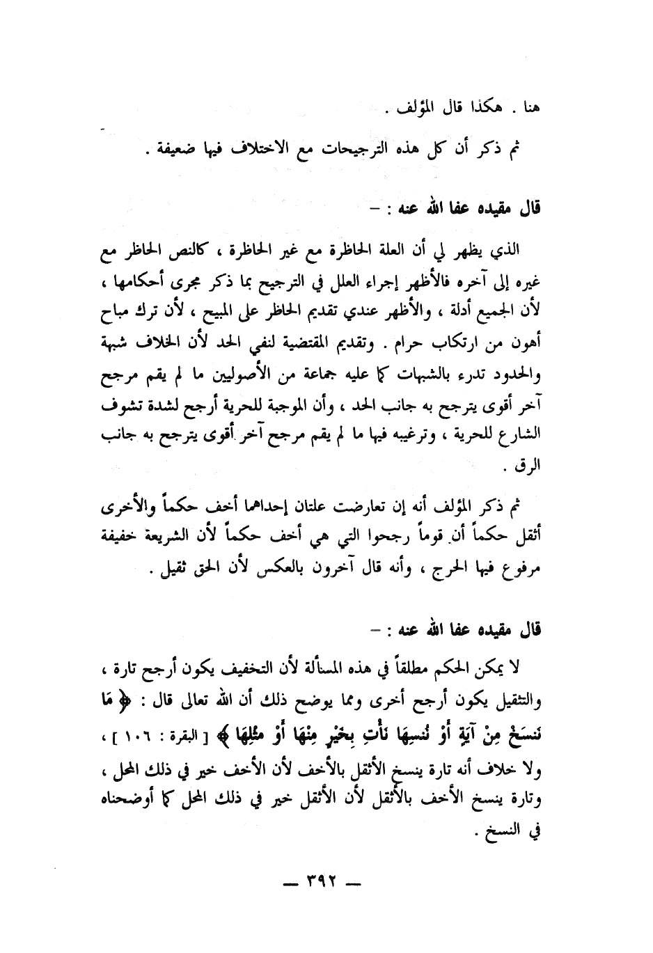 ... لا يمكن الحكم مطلقاً في هذه المسألة لأن التخفيف يكون ارجح تارة، والتثقيل يكون أرجح أخرى ومما يوضح ذلك أن الله تعالى قال: " ما ننسخ من آية أو ننسها نأت بخير منها أو مثلها، ولا خلاف أنه تارة ينسخ الأثقل بالأخف لأن الأخف خير في ذلك المحل، وتارة ينسخ الأخف بالأثقل لأن الأثقل خير في ذلك المحل كم أوضحناه في النسخ.