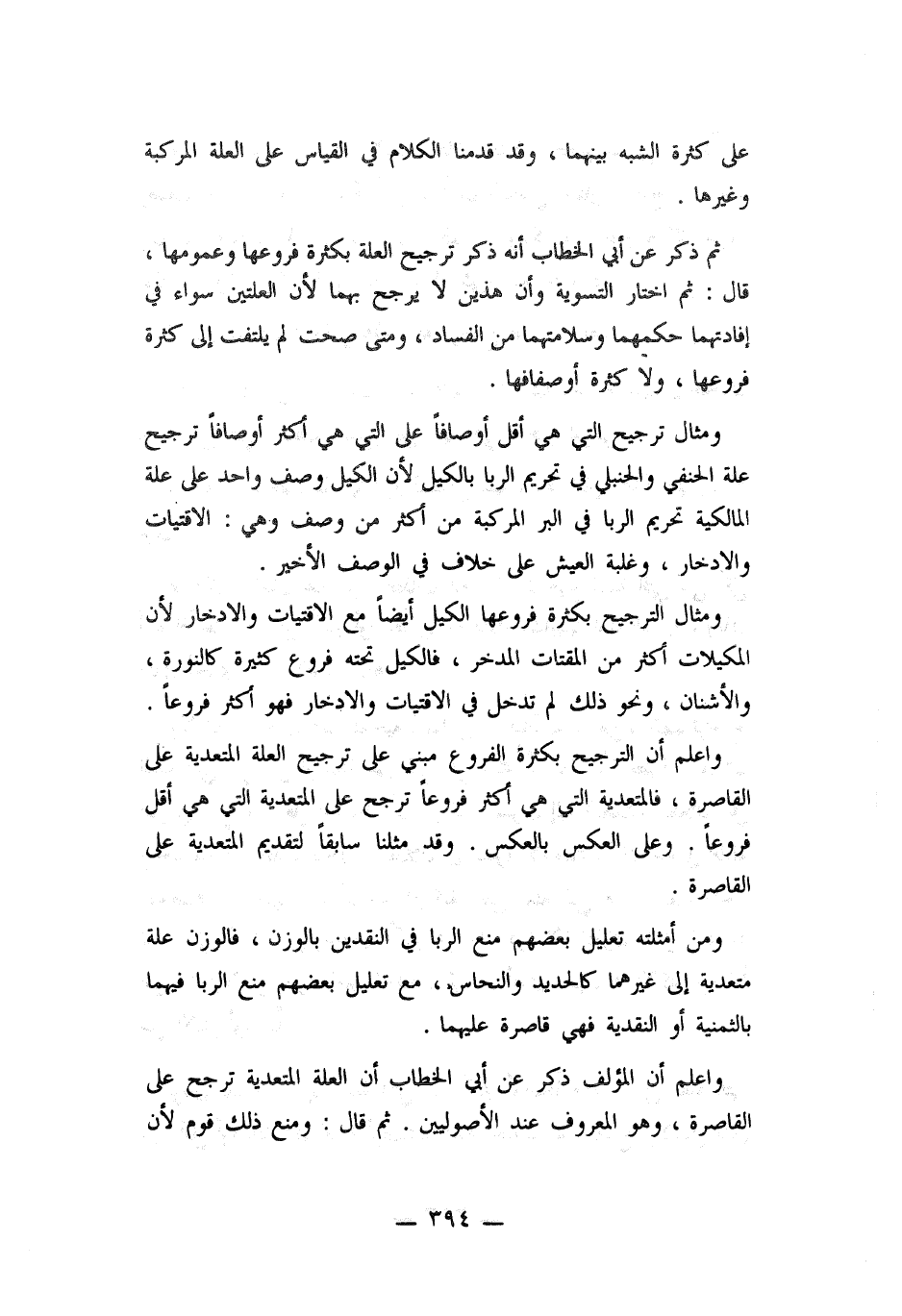 ... ثم ذكر عن أبي الخطاب أنه ذكر ترجيح العلة بكثرة فروعها وعمومها، قال: ثم اختار التسوية وان هذين لا يرجح بهما لأن العلتين سواء في افادتهما حكمهما وسلامتهما من الفساد، ومتى صحت لم يلتفت إلى كثرة فروعها ن ولا كثرة أوصافها.