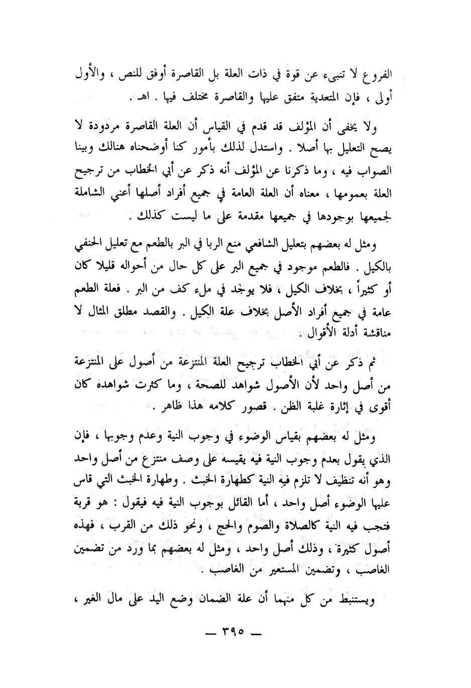 ... ولا يخفي أن المؤلف قد قدم في القياس أن العلة القاصرة مردودة لا يصح التعليل بها أصلاً. واستدل لذلك بأمور كما جاء أوضحناه وبينا الصواب فيه، وما ذكرناه عن المؤلف أنه ذكر عن أبي الخطاب من ترجيح العلة بعمومها ن معناه أن العلة العامة في جميع أفراد أصلها أعني الشاملة لجميعها بوجودها في جميعها مقدمة على ما ليست كذلك.