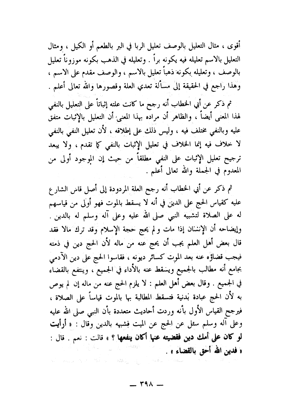 ... ثم ذكر عن أبي الخطاب أنه رجح العلة المردودة إلى أصل قاس الشارع عليه كقياس الحج على الدين في أنه لا يسقط بالموت فهو أولى من قياسهم له على الصلاة لتشبيه النبي صلى الله عليه وسلم له بالدين. وإيضاحه أن الإنسان إذا مات ولم يحج حجة الإسلام وقد ترك مالاً فقد قال بعض أهل العلم يجب أن يحج عنه ماله لأن الحج دين في ذمته فيجب قضاؤه عنه بعد الموت كسائر ديونه، فقاسوا الحج على دين الآدمي بجامع أنه مطالب بالجميع ويسقط عنه بالأداء في الجميع، وينتفع بالقضاء في الجميع.