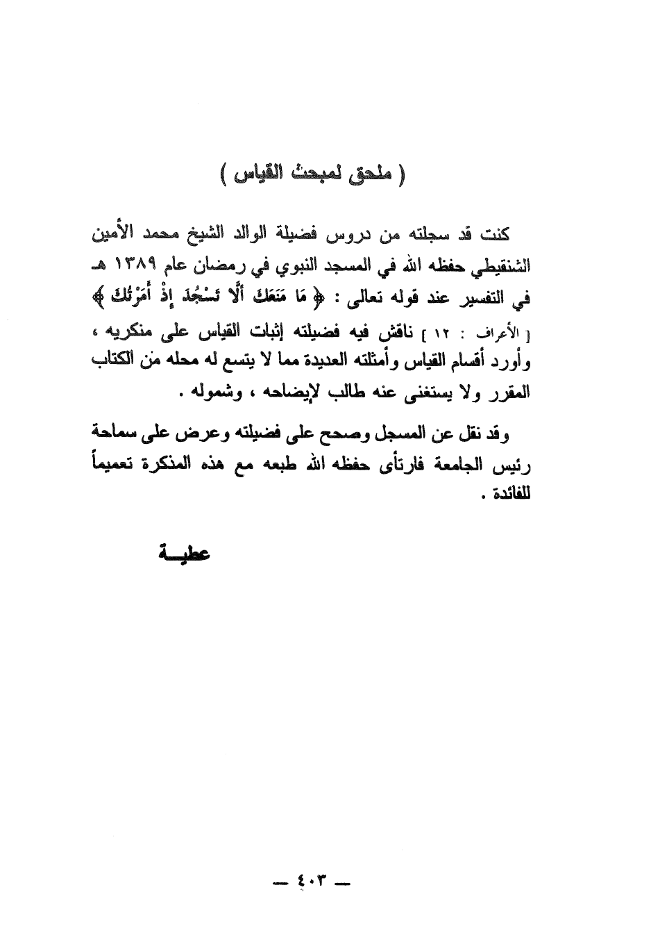 ... كنت قد سجلته من دروس فضيلة الوالد الشيخ محمد الأمين الشنقيطي حفظه الله في المسجد النبوي في رمضان عام 1389هـ في التفسير عند قوله تعالى: (ما منعك ألا تسجد إذ أمرتك) ناقش فيه فضيلته إثبات القياس على منكريه، وأورد أقسام القياس وأمثلته العديدة مما لا يتسع له محله من الكتاب المقرر