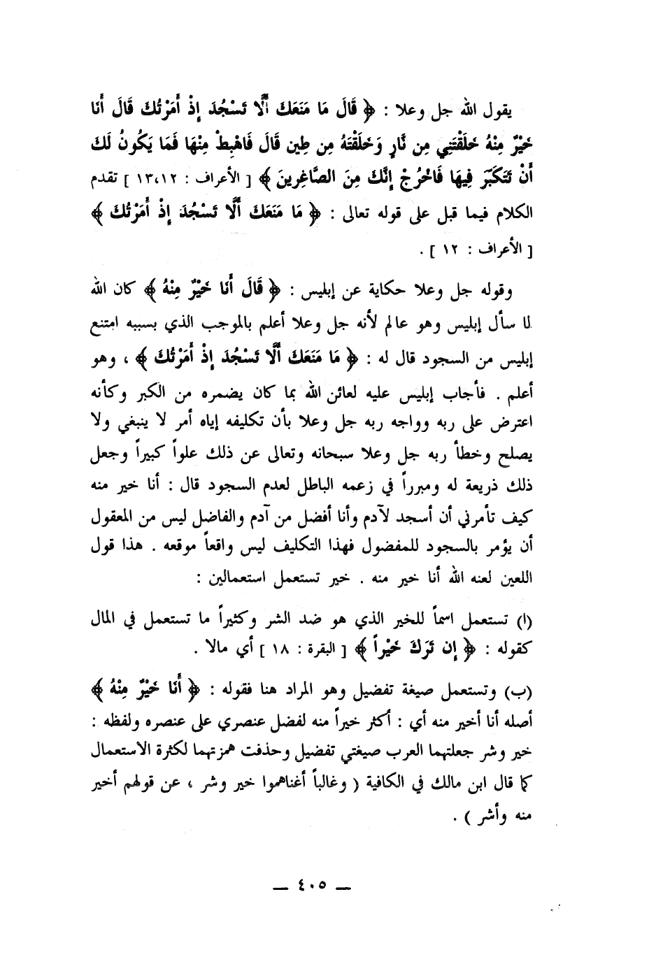 (أ) تستعمل اسماً للخير الذي هو ضد الشر وكثيراً ما تستعمل في المال كقوله: إن ترك خيراً أي مالاً. (ب) وتستعمل صيغة تفضيل وهو المراد هنا فقوله أنا خير منه أصله أنا أخير منه أي أكثر خيراً منه لفضل عنصري على عنصره ولفظه: خير وشر جعلتهما العرب صيغتي تفضيل وحذفت همزتها لكثرة الاستعمال كما قال ابن مالك في الكافية (وغالباً أغناهموا خير وشر، عن قولهم أخير منه واشر) .