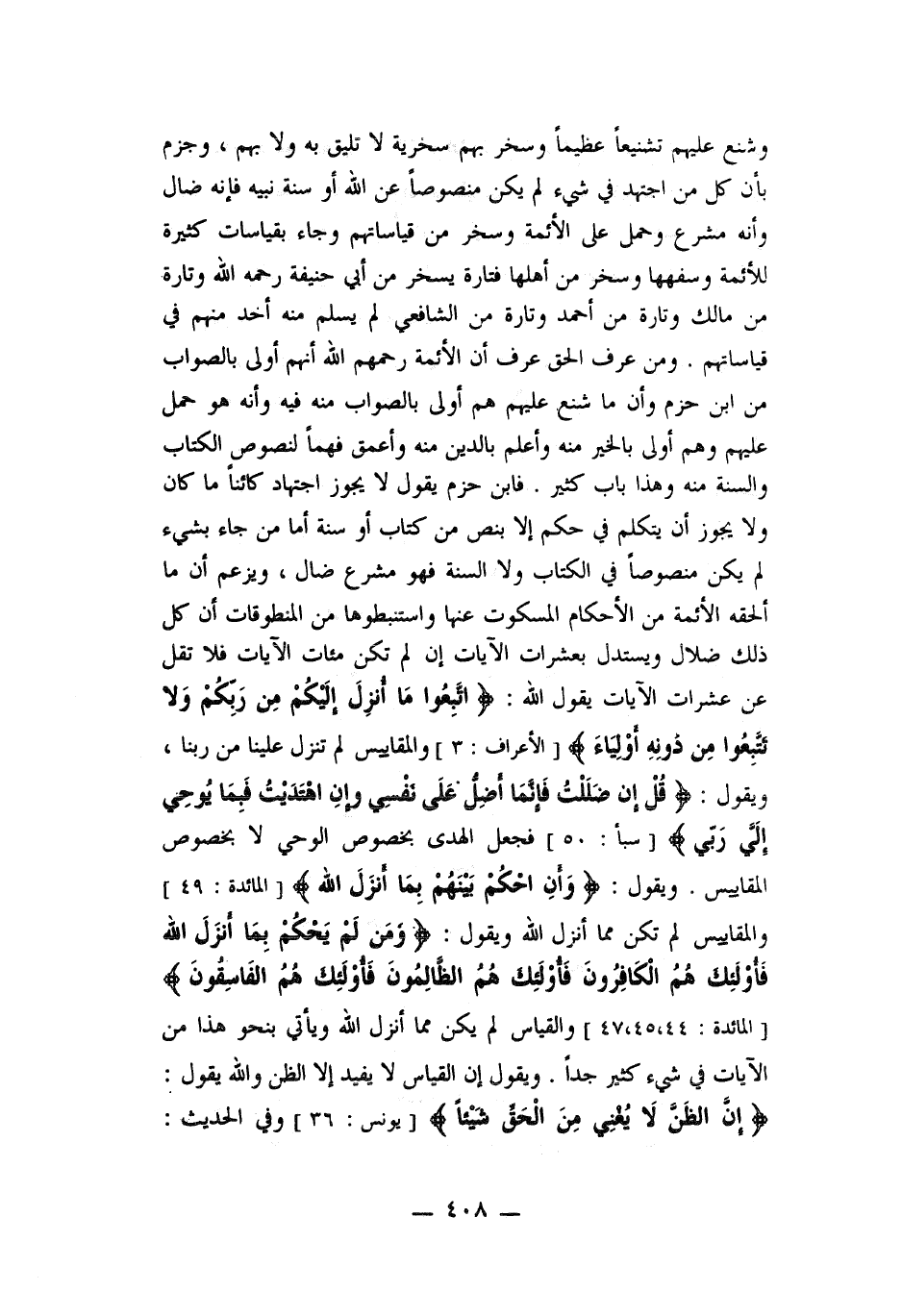 الآيات يقول "الله قال اتبعوا ما أنزل اليكم من ربكم ولا تتبعوا من دونه أولياء " والمقاييس لم تنزل علينا من ربنا، ويقول " قل ان ضللت فانما أضل على نفسي وان اهتديت فيما يوحى إلى ربي فجعل الهدى بخصوص الوحي لا بخصوص المقاييس. ويقول "وأن أحكم بينهم بما أنزل الله " والمقاييس لم تكن مما أنزل الله ويقول " ومن لم يحكم بما أنزل الله فأولئك هم الكافرون فأولئك هم الظالمون فأولئك هم الفاسقون" والقياس لم يكن مما أنزل الله ويأتي بنحو هذا من الآيات في شيء كثير جداً.