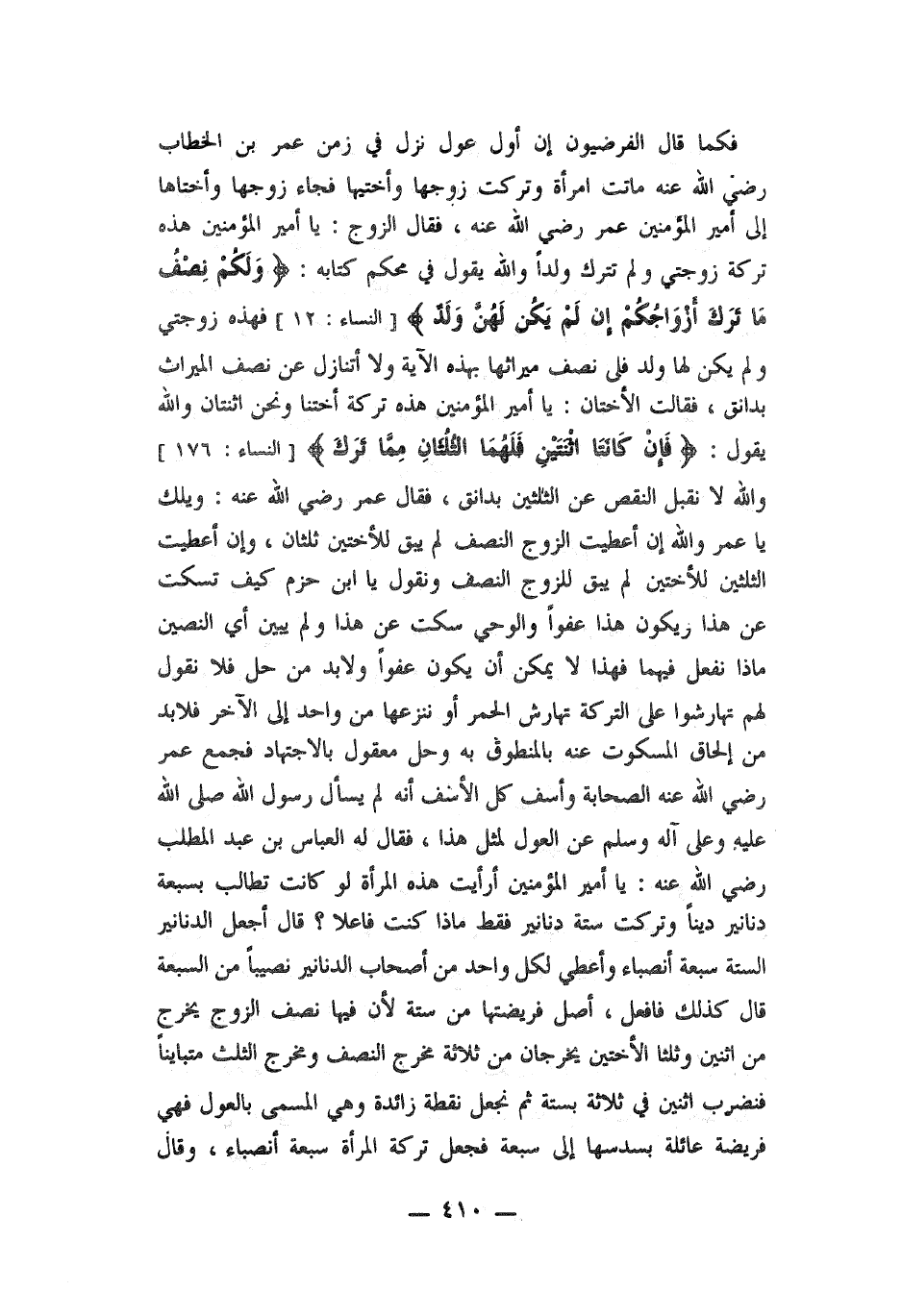 عفواً ولابد من حل فلا نقول لهم تهارشوا على التركة تهارش الحمر أو ننزعها من واحد إلى الآخر فلابد من الحاق المسكوت عنه بالمنطوق به وحل مقعول بالاجتهاد فجمع عمر رضي الله عنه الصحابة وأسف كل الأسف أنه لم يسأل رسول الله - صلى الله عليه وسلم - عن العول لمثل هذا، فقال له العباس بن عبد المطلب رضي الله عنه: ياأمير المؤمنين أرأيت هذه المرأة لو كانت تطالب بسبعة دنانير ديناً وتركت ستة دنانير فقط ماذا كنت فاعلاً؟ قال: اجعل الدنانير الستة سبعة أنصباء وأعطي لكل واحد من أصحاب الدنانير نصيباً من السبعة قال