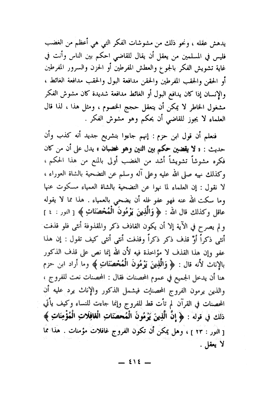 فنعلم أن قول ابن حزم: انهم جاؤوا بتشريع جديد أنه كذب وان حديث: لا يقضين حكم بين اثنين وهو عصيان يدل على أن من كان فكره مشوشاً تشويشاً أشد من الغضب أولى بالمنع من هذا الحكم، وكذلك نهيه - صلى الله عليه وسلم - عن التضحية بالشاة العوراء، لا نقول: ان العلماء لما نهوا عن التضحية بالشاة العمياء.