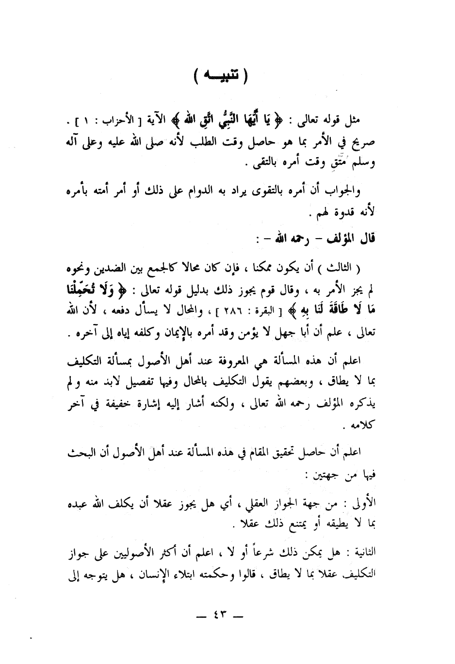 الثانية: هل يمكن ذلك شرعاً أو لا، اعلم أن أكثر الأصوليين على جواز التكليف عقلا بما لا يطاق، قالوا وحكمته ابتلاء الانسان، هل يتوجه إلى
