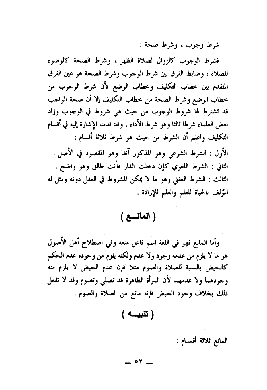 وأما المانع فهو في اللغة اسم فاعل منعه وفي اصطلاح أهل الأصول هو ما لا يلزم من عدمه وجود ولا عدم ولكنه يلزم من وجوده عدم الحكم كالحيض بالنسبة للصلاة والصوم مثلاً فان عدم الحيض لا يلزم منه وجودهما ولا عدمهما لان المرأة الطاهرة قد تصلي وتصوم وقد لا تفعل ذلك بخلاف وجود الحيض فانه مانع من الصلاة والصوم.