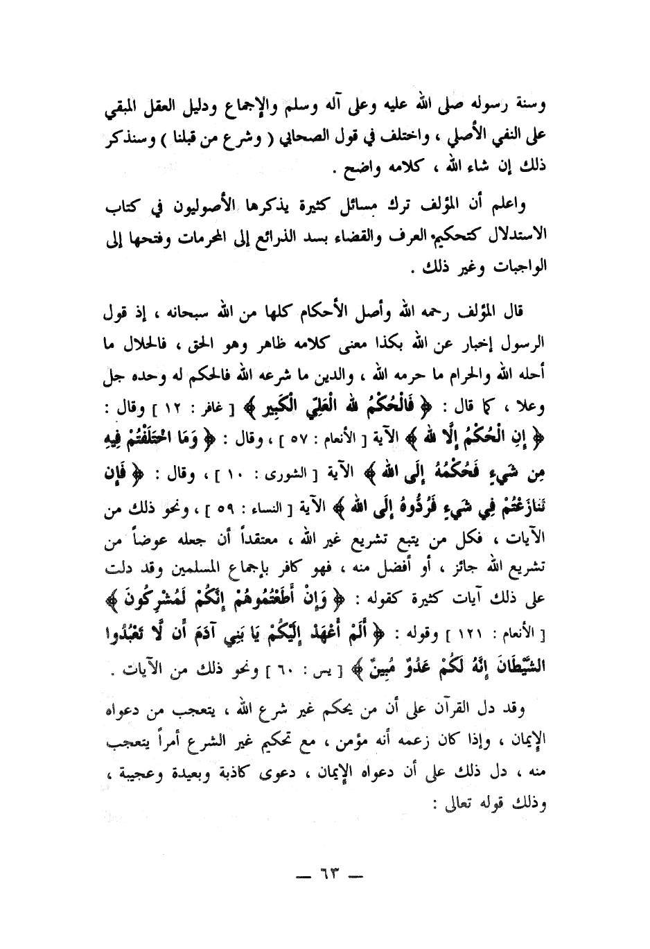 إلى الله" الآية، ونحو ذلك من الآيات، فكل من يتبع تشريع غير الله، معتقداً أن جعله عوضاً من تشريع الله جائز، أو أفضل منه، فهو كافر باجماع المسلمين وقد دلت على ذلك آيات كثيرة كقوله " وان أطعتموهم انكم لمشركون" وقوله " ألم أعهد اليكم يابني آدم أن لا تعبدوا الشيطان انه لكم عدو مبين"ونحو ذلك من الآيات.