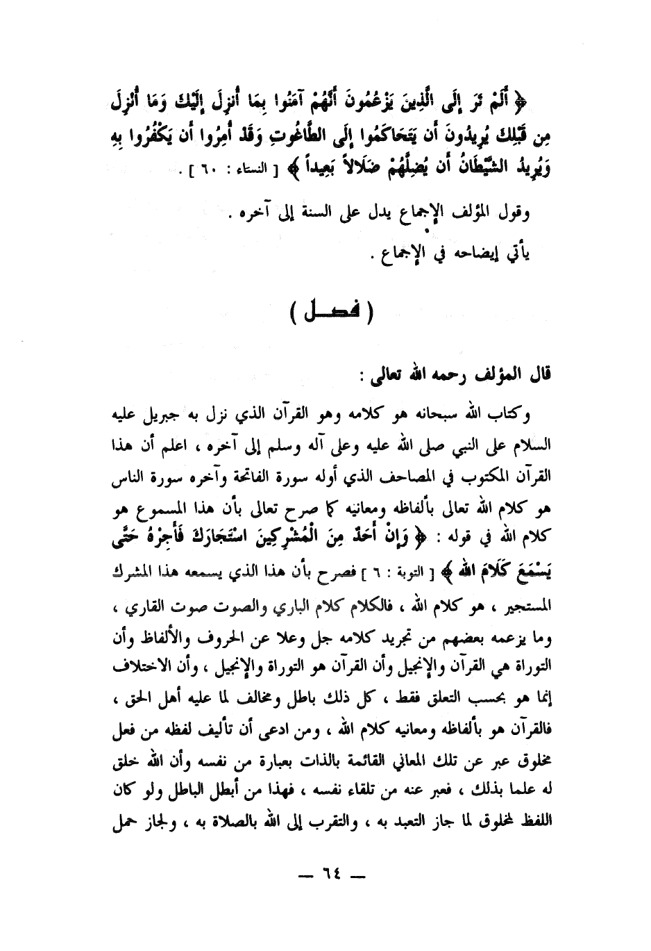 وكتاب الله سبحانه هو كلامه وهو القرآن الذي نزل به جبريل عليه السلام على النبي - صلى الله عليه وسلم - إلى آخره، اعلم أن هذا القرآن المكتوب في المصاحف الذي أوله سورة الفاتحة وآخره سورة الناس هو كلام الله تعال بألفاظه ومعانيه كما صرح تعالى بأن هذا المسموع هو كلام الله في قوله: " وان أحد المشركين استجارك فأجره حتى يسمع كلام الله" فصرح بأن هذا الذي يسمعه هذا المشرك المستجير، هو كلام الله، فالكلام كلام الباري والصوت صوت القاري، وما يزعمه بعضهم من تجريد كلامه جل وعلا عن الحروف والألفاظ وأن