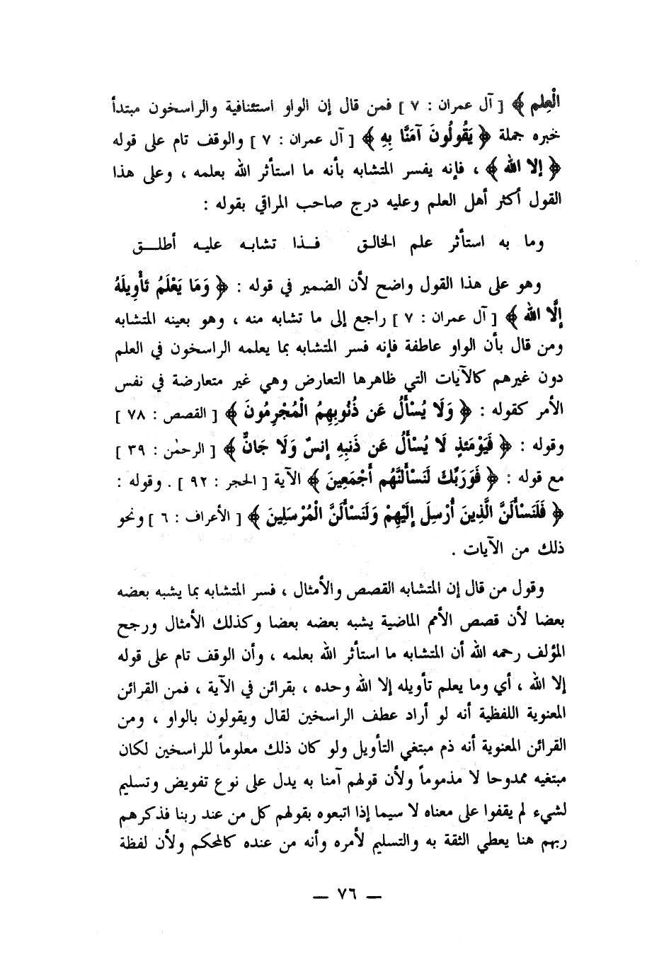 العلم " فمن قال ان الواو استئنافية والراسخون مبتدأ خبره جملة " يقولون آمنا به " والوقف تام على قوله الا الله، فانه يفسر المتشابه بأنه ما استأثر الله بعلمه، وعلى هذا القول أكثر أهل العلم وعليه درجة صاحب المراقي بقوله: