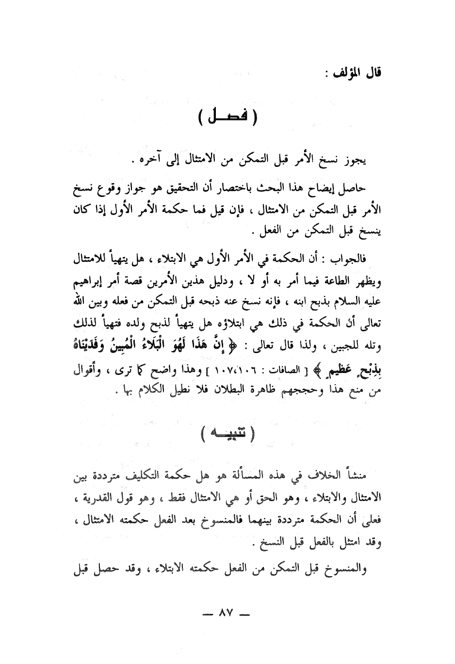 حاصل ايضاح هذا البحث باختصار أن التحقيق هو جواز وقوع نسخ الأمر قبل التمكن من الامتثال، فان قيل فما حكمة الأمر الأول اذا كان ينسخ قبل التمكن من الفعل. فالجواب: أن الحكمة في الأمر الأول هي الابتلاء، هل يتهيأ للامتثال ويظهر الطاعة فيما أمر به أولاً، ودليل هذين الأمرين قصة أمر إبراهيم عليه السلام بذبح ابنه، فانه نسخ عنه ذبحه قبل التمكن من فعله وبين الله تعالى أن الحكمة في ذلك هي ابتلاؤه هل يتهيأ لذبح ولده فتهيأ لذلك وتله للجبين، ولذا قال تعالى: " إن هذا لهو البلاء المبين وفديناه بذبح عظيم"