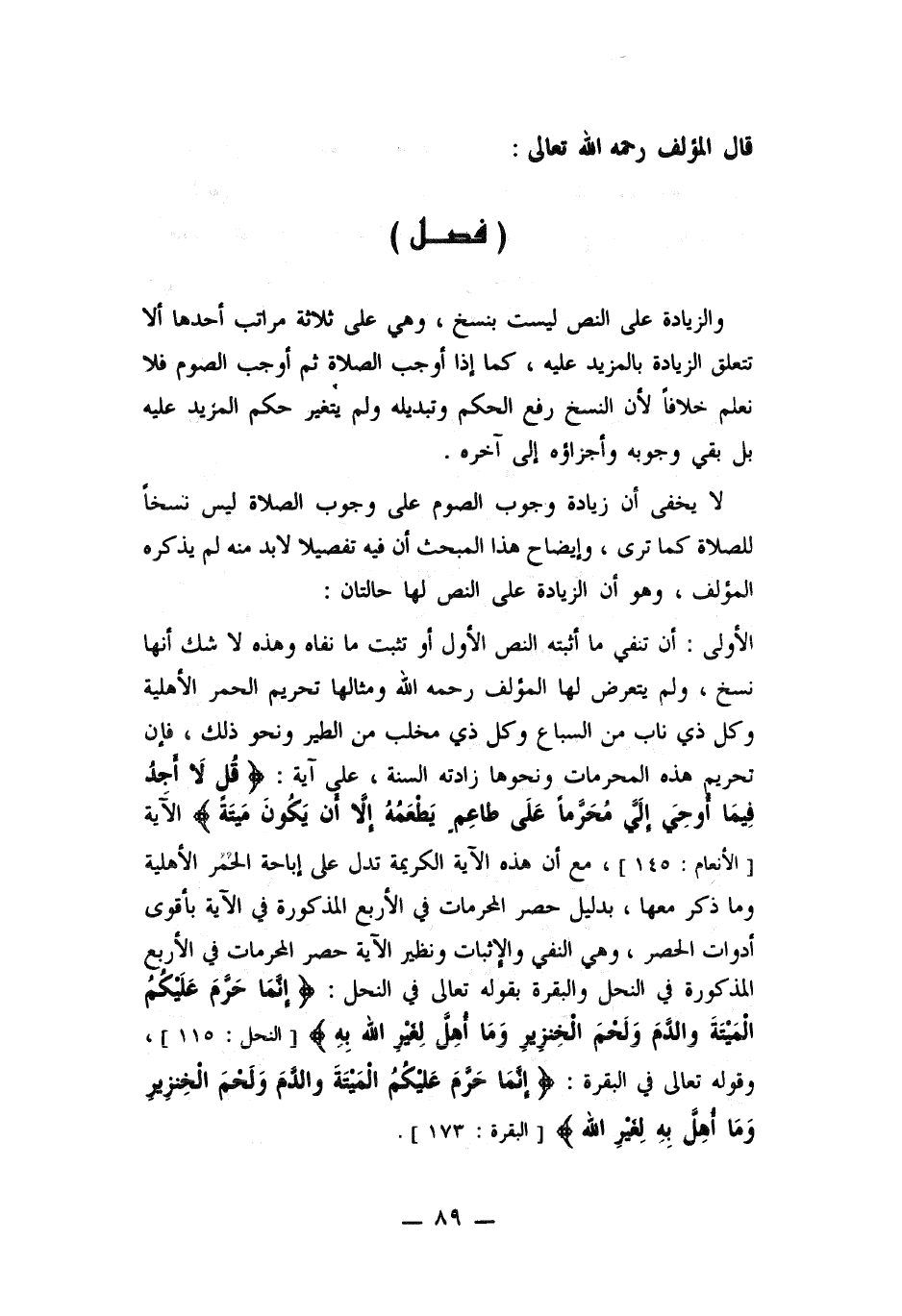 الأولى: أن تنفي ما أثبته النص الأول أو تثبت ما نفاه وهذه لا شك أنها نسخ، ولم يتعرض لها المؤلف رحمه الله ومثالها تحريم الحمر الأهلية وكل ذي ناب من السباع وكل ذي مخلب من الطير ونحو ذلك، فان تحريم هذه المحرمات ونحوها زادته السنة، على آية " قل لا أجد فيما أوحى إلى محرما على طاعم يطعمه الا أن يكون ميتة " الآية، مع أن هذه الآية