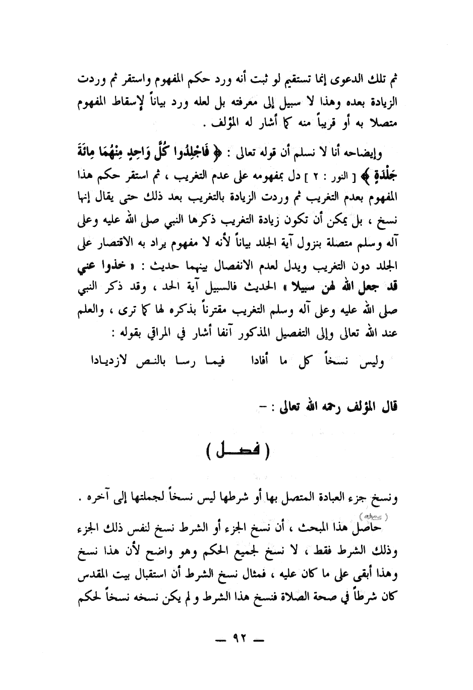 وايضاحه أنا لا نسلم أن قوله تعالى " فاجلدوا كل واحد منهما مائة جلدة" دل بمفهومه على عدم التغريب، ثم استقر حكم هذا المفهوم بعدم التغريب ثم وردت الزيادة بالتغريب بعد ذلك حتى يقال أنها نسخ ن بل يمكن أن تكون زيادة التغريب ذكرها النبي - صلى