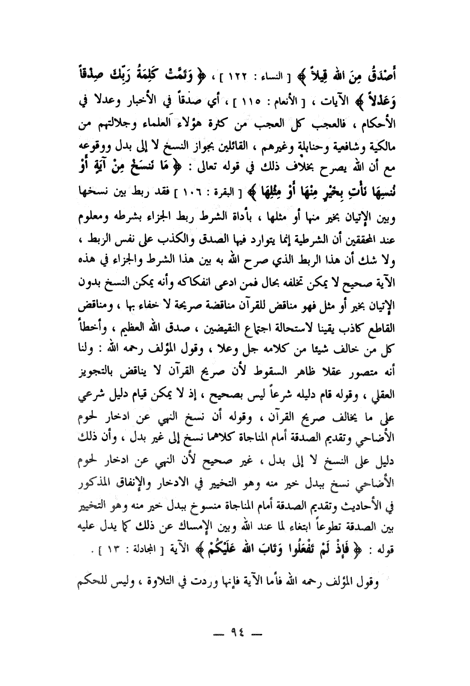أصدق من الله قيلا"، " وتمت كلمة ربك صدقاً وعدلاً، الآيات، أي صدقاً في الأخبار وعدلاً في الأحكام، فالعجب كل العجب من كثرة هؤلاء العلماء وجلالتهم من مالكية وشافعية وحنابلة وغيرهم، القائلين بجواز النسخ لا إلى بدل ووقوعه مع أن الله يصرح بخلاف ذلك في قوله تعالى "ما ننسخ من آية أو ننسها نأت بخير منها أو مثلها " فقد ربط