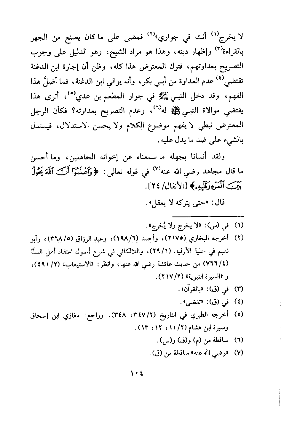 لا يخرج (¬1) أنت في جواري " (¬2) فمضى على ما كان يصنع من الجهر بالقراءة (¬3) وإظهار دينه، وهذا هو مراد الشيخ، وهو الدليل على وجوب التصريح بعداوتهم، فترك المعترض هذا كله، وظن أن إجارة ابن الدغنة تقتضي (¬4) عدم العداوة من أبي بكر، وأنه يوالي ابن الدغنة، فما أضلَّ هذا الفهم، «وقد دخل النبي صَلَّى اللهُ عَلَيْهِ وَسَلَّم في جوار المطعم بن عدي» (¬5) أترى هذا يقتضي موالاة النبي صَلَّى اللهُ عَلَيْهِ وَسَلَّم له (¬6) وعدم التصريح بعداوته؟ فكأن الرجل المعترض نبطي لا يفهم موضوع الكلام ولا يحسن الاستدلال، فيستدل بالشيء على ضد ما يدل عليه.