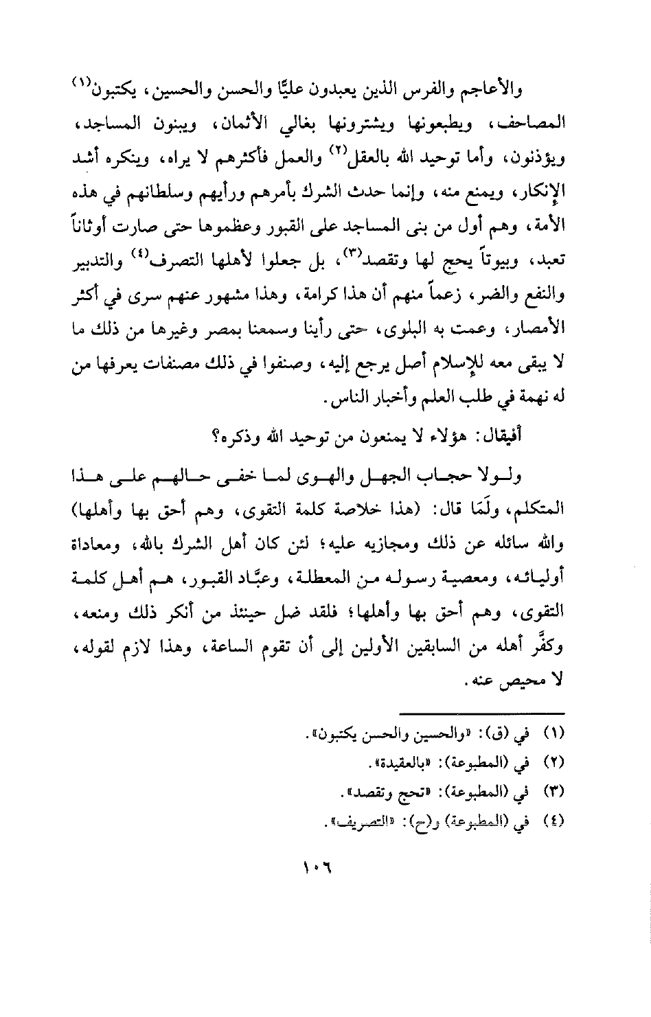 والأعاجم والفرس الذين يعبدون عليَّا والحسن والحسين، يكتبون (¬1) المصاحف، ويطبعونها ويشترونها بغالي الأثمان، ويبنون المساجد، ويؤذنون، وأما توحيد الله بالعقل (¬2) والعمل فأكثرهم لا يراه، وينكره أشد الإنكار، ويمنع منه، وإنما حدث الشرك بأمرهم ورأيهم وسلطانهم في هذه الأمة، وهم أول من بنى المساجد على القبور وعظموها حتى صارت أوثانا تعبد، وبيوتا يحج لها وتقصد (¬3) بل جعلوا لأهلها التصرف (¬4) والتدبير والنفع والضر، زعما منهم أن هذا كرامة، وهذا مشهور عنهم سرى في أكثر الأمصار، وعمت به البلوى، حتى رأينا وسمعنا بمصر وغيرها من ذلك ما لا يبقى معه للإسلام أصل يرجع إليه، وصنفوا في ذلك مصنفات يعرفها من له نهمة في طلب العلم وأخبار الناس.