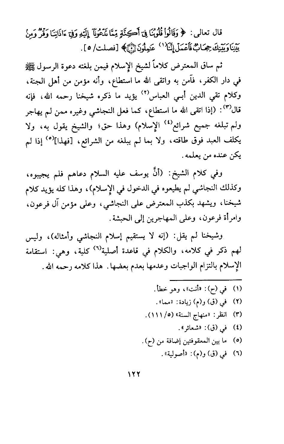 وشيخنا لم يقل: (إنه لا يستقيم إسلام النجاشي وأمثاله) ، وليس لهم ذكر في كلامه، والكلام في قاعدة أصلية (¬6) كلية، وهي: استقامة الإسلام بالتزام الواجبات وعدمها بعدم بعضها. هذا كلامه رحمه الله.