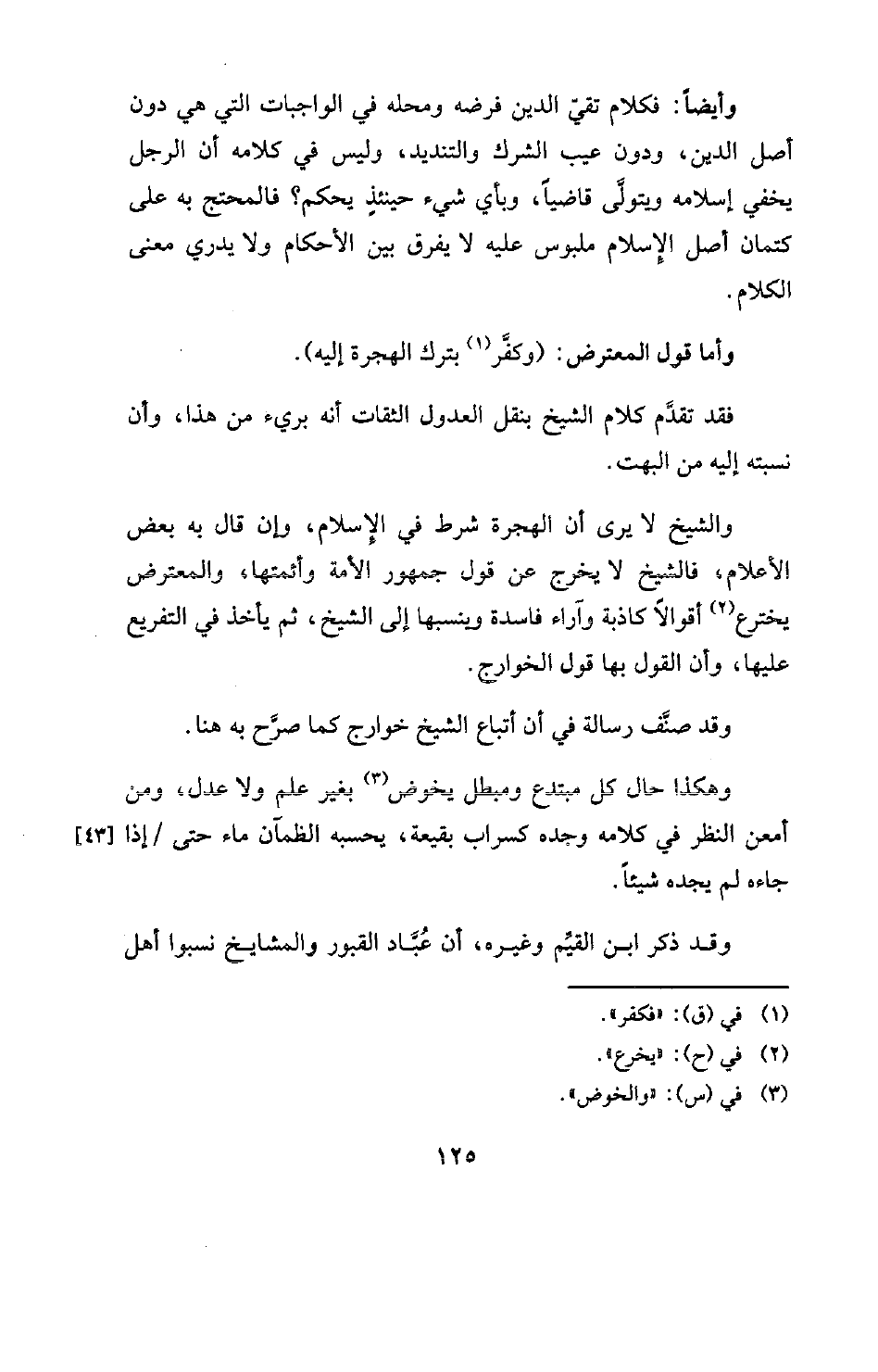 والشيخ لا يرى أن الهجرة شرط في الإسلام، وإن قال به بعض الأعلام، فالشيخ لا يخرج عن قول جمهور الأمة وأئمتها، والمعترض يخترع (¬2) أقوالا كاذبة وآراء فاسدة وينسبها إلى الشيخ، ثم يأخذ في التفريع عليها، وأن القول بها قول الخوارج.