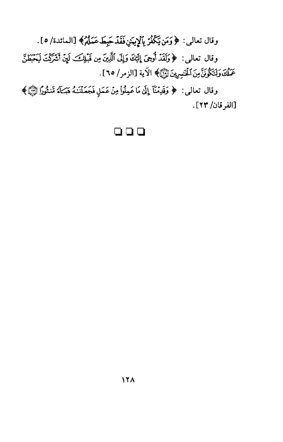 وقال تعالى: {وَمَنْ يَكْفُرْ بِالْإِيمَانِ فَقَدْ حَبِطَ عَمَلُهُ} [المائدة: 5] [المائدة / 5] .