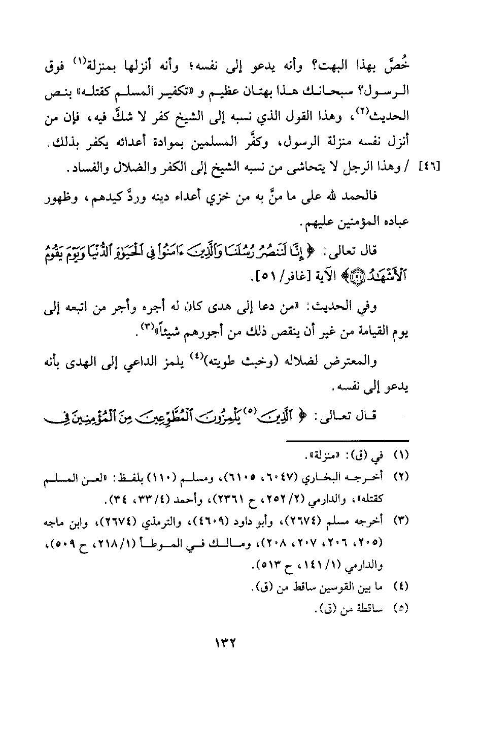 خُصَّ بهذا البهت؟ وأنه يدعو إلى نفسه؛ وأنه أنزلها بمنزلة (¬1) فوق الرسول؟ سبحانك هذا بهتان عظيم و " «تكفير المسلم كقتله» " بنص الحديث (¬2) وهذا القول الذي نسبه إلى الشيخ كفر لا شك فيه، فإن من أنزل نفسه منزلة الرسول، وكفَّر المسلمين بموادة أعدائه يكفر بذلك. [46] وهذا الرجل لا يتحاشى من نسبه الشيخ إلى الكفر والضلال والفساد.