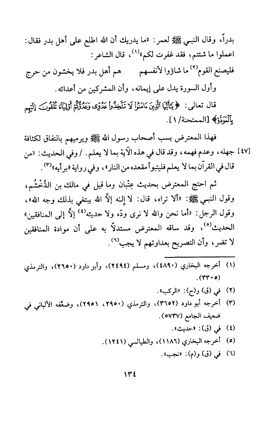 ثم احتج المعترض بحديث عِتْبان وما قيل في مالك بن الدُخْشُم، وقول النبي صَلَّى اللهُ عَلَيْهِ وَسَلَّم: " «ألا تراه، قال: لا إله إلا الله يبتغي بذلك وجه الله» "، وقول الرجل: "أما نحن والله لا نرى وده ولا حديثه (¬4) إلا إلى المنافقين " الحديث (¬5) وقد ساقه المعترض مستدلا به على أن موادة المنافقين لا تضر، وأن التصريح بعداوتهم لا يجب (¬6) .