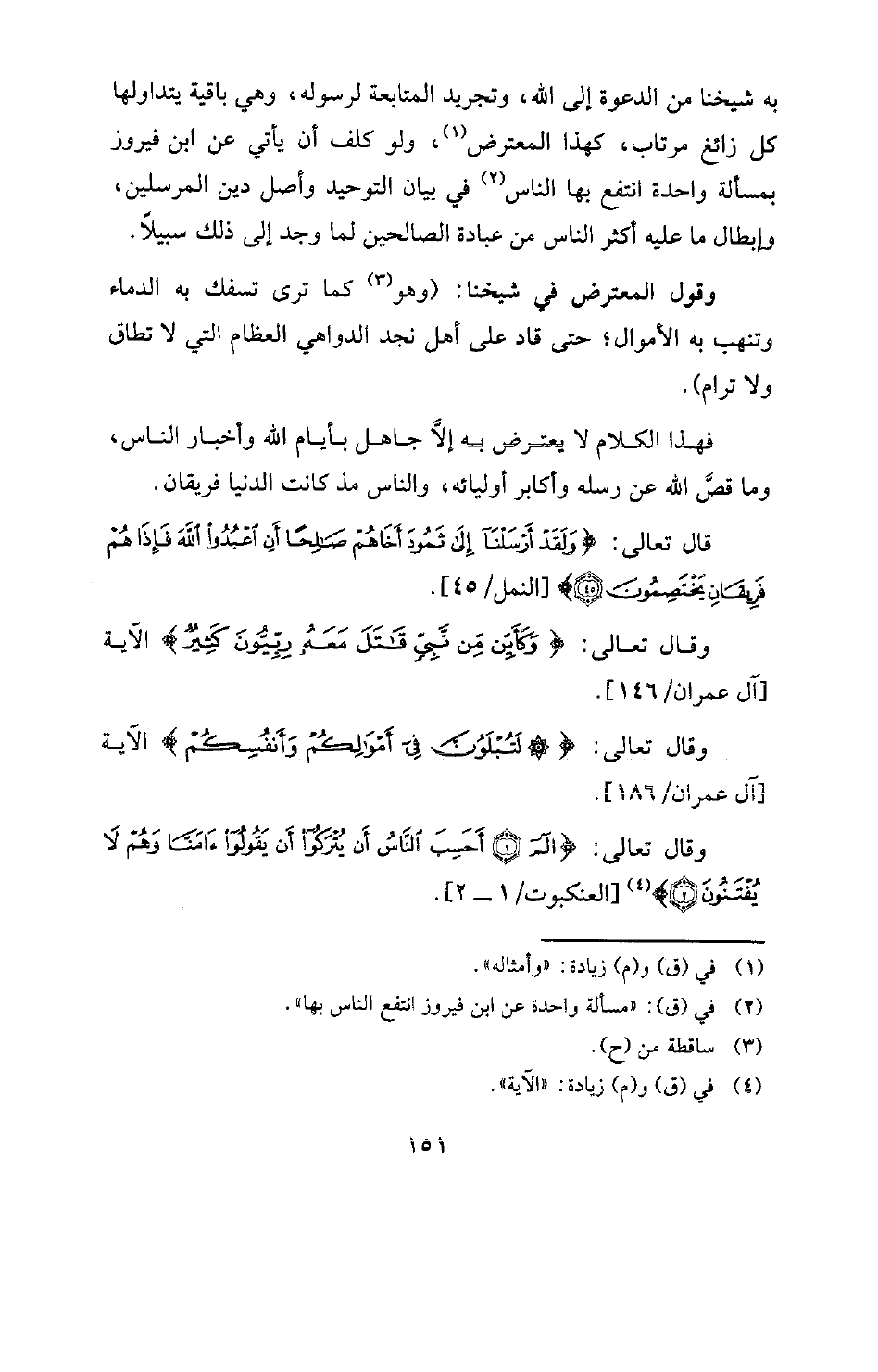 به شيخنا من الدعوة إلى الله، وتجريد المتابعة لرسوله، وهي باقية يتداولها كل زائغ مرتاب، كهذا المعترض (¬1) ولو كلف أن يأتي عن ابن فيروز بمسألة واحدة انتفع بها الناس (¬2) في بيان التوحيد وأصل دين المرسلين، وإبطال ما عليه أكثر الناس من عبادة الصالحين لما وجد إلى ذلك سبيلاً.