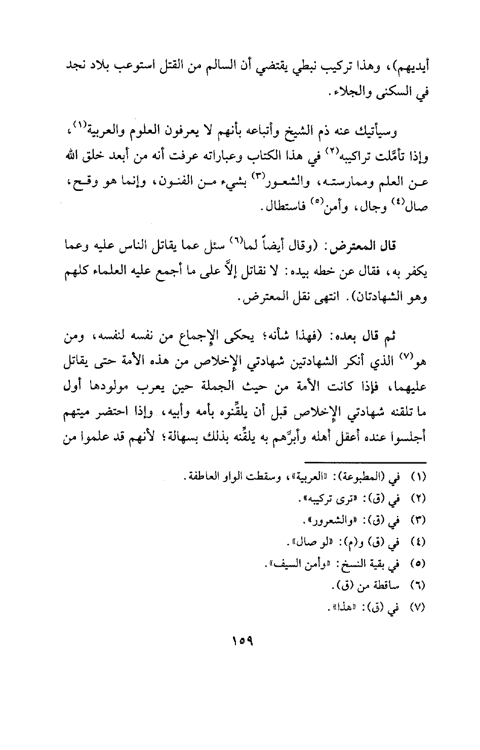 وسيأتيك عنه ذم الشيخ وأتباعه بأنهم لا يعرفون العلوم والعربية (¬1) إذا تأملت تراكيبه (¬2) في هذا الكتاب وعباراته عرفت أنه من أبعد خلق الله عن العلم وممارسته، والشعور (¬3) بشيء من الفنون، وإنما هو وقح، صال (¬4) وجال، وأمن (¬5) فاستطال.