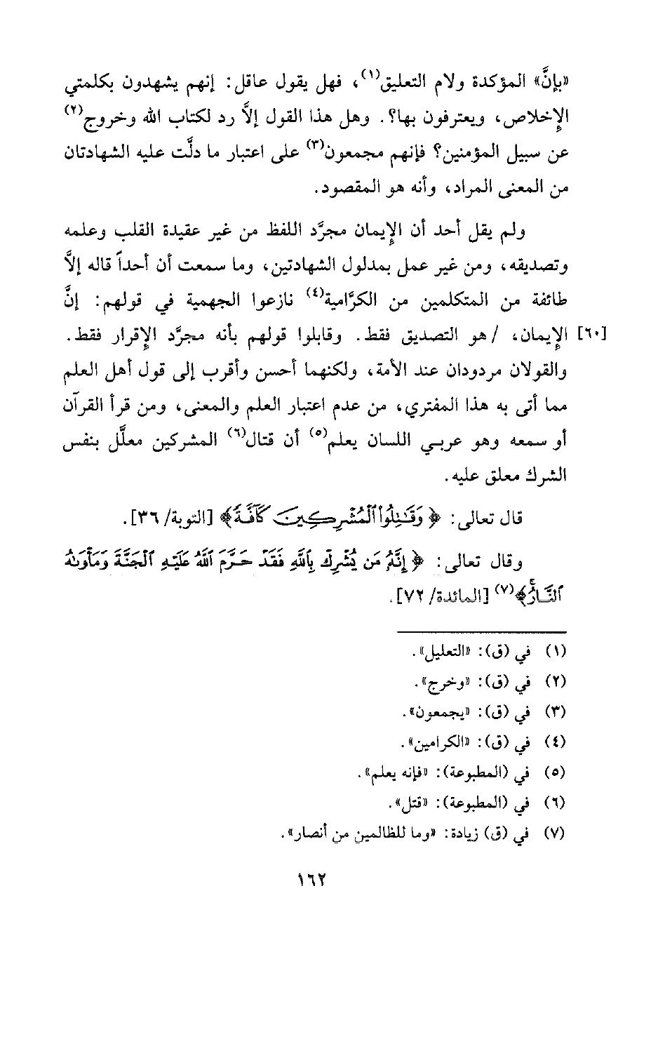 ولم يقل أحد أن الإيمان مجرد اللفظ من غير عقيدة القلب وعلمه وتصديقه، ومن غير عمل بمدلول الشهادتين، وما سمعت أن أحدا قاله إلا طائفة من المتكلمين من الكرامية (¬4) نازعوا الجهمية في قولهم: إن [60] ، الإيمان، هو التصديق فقط. وقابلوا قولهم بأنه مجرد الإقرار فقط. والقولان مردودان عند الأمة، ولكنهما أحسن وأقرب إلى قول أهل العلم مما أتى به هذا المفتري، من عدم اعتبار العلم والمعنى، ومن قرأ القرآن أو سمعه وهو عربي اللسان يعلم (¬5) أن قتال (¬6) المشركين معلل بنفس الشرك معلق عليه.