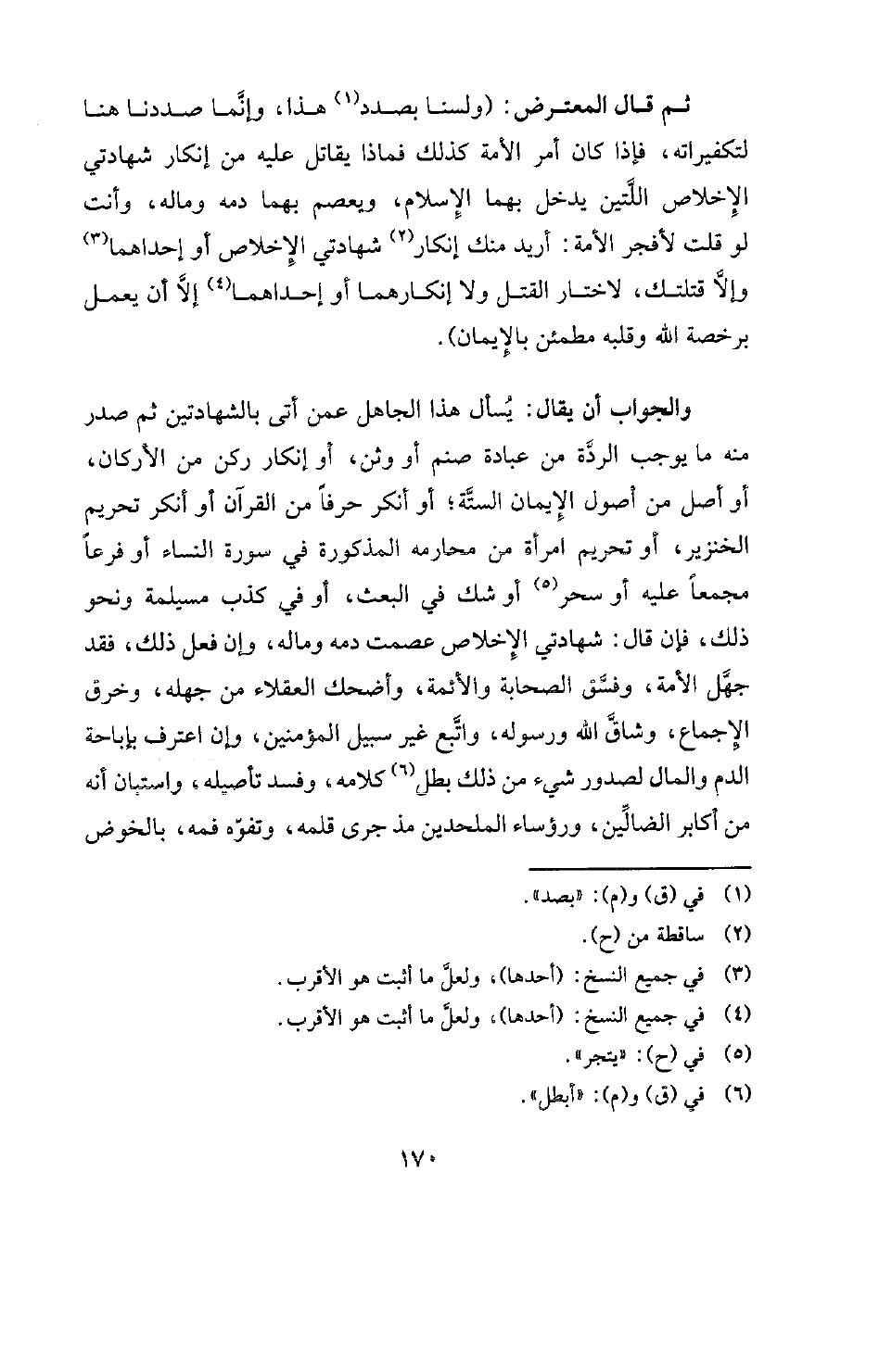 والجواب أن يقال: يسأل هذا الجاهل عمن أتى بالشهادتين ثم صدر منه ما يوجب الردة من عبادة صنم أو وثن، أو إنكار ركن من الأركان، أو أصل من أصول الأيمان الستة؛ أو أنكر حرفا من القرآن أو أنكر تحريم الخنزير، أو تحريم امرأة من محارمه المذكورة في سورة النساء أو فرعا مجمعا عليه أو سحر (¬5) أو شك في البعث، أو في كذب مسيلمة ونحو ذلك، فإن قال: شهادتي الإخلاص عصمت دمه وماله، وإن فعل ذلك، فقد جهل الأمة، وفسق الصحابة والأئمة، وأضحك العقلاء من جهله، وخرق الإجماع، وشاق الله ورسوله، واتبع غير سبيل المؤمنين، وإن اعترف بإباحة الدم والمال لصدور شيء من ذلك بطل (¬6) كلامه، وفسد تأصيله، واستبان أنه من أكابر الضالين، ورؤساء الملحدين مذ جرى قلمه، وتفوه فمه، بالخوض