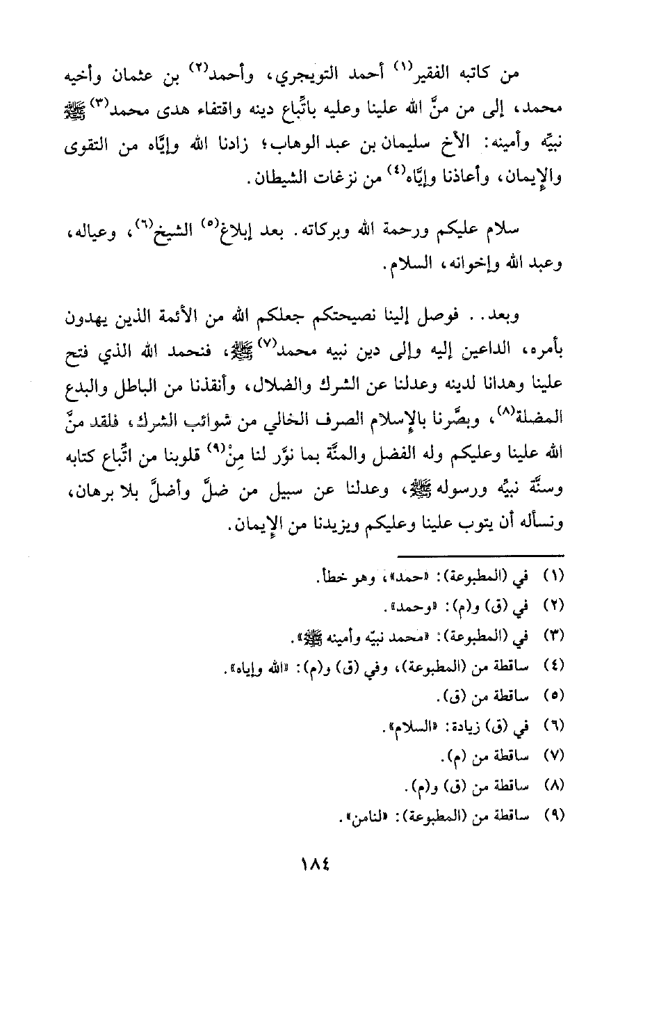 من كاتبه الفقير (¬1) أحمد التويجري، وأحمد (¬2) بن عثمان وأخيه محمد، إلى من من الله علينا وعليه باتباع دينه واقتفاء هدى محمد (¬3) صلى الله عليه وسلم نبيه وأمينه: الأخ سليمان بن عبد الوهاب؟ زادنا الله وإياه من التقوى والإيمان، وأعاذنا وإياه (¬4) من نزغات الشيطان. سلام عليكم ورحمة الله وبركاته. بعد إبلاغ (¬5) الشيخ (¬6) وعياله، وعبد الله وإخوانه، السلام. وبعد. . فوصل إلينا نصيحتكم جعلكم الله من الأئمة الذين يهدون بأمره، الداعين إليه وإلى دين نبيه محمد (¬7) صلى الله عليه وسلم، فنحمد الله الذي فتح علينا وهدانا لدينه وعدلنا عن الشرك والضلال، وأنقذنا من الباطل والبدع المضلة (¬8) وبصرنا بالإسلام الصرف الخالي من شوائب الشرك، فلقد من الله علينا وعليكم وله الفضل والمنة بما نور لنا من (¬9) قلوبنا من اتباع كتابه وسنة نبيه ورسوله صلى الله عليه وسلم، وعدلنا عن سبيل من ضل وأضل بلا برهان، ونسأله أن يتوب علينا وعليكم ويزيدنا من الإيمان.