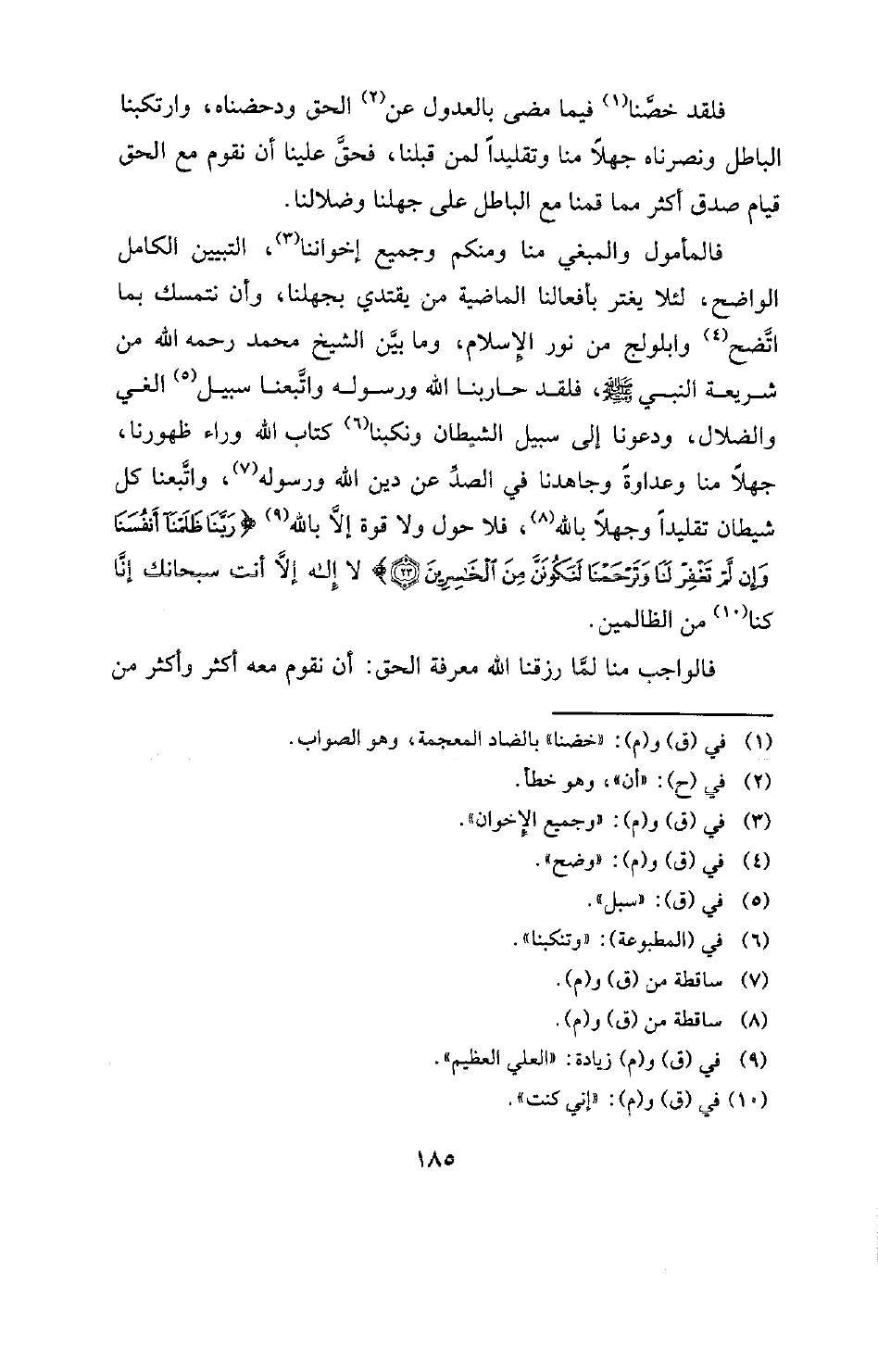 فلقد خصنا (¬1) فيما مضى بالعدول عن (¬2) الحق ودحضناه، وارتكبنا الباطل ونصرناه جهلا منا وتقليدا لمن قبلنا، فحق علينا أن نقوم مع الحق قيام صدق أكثر مما قمنا مع الباطل على جهلنا وضلالنا. فالمأمول والمبغي منا ومنكم وجميع إخواننا (¬3) التبيين الكامل الواضح، لئلا يغتر بأفعالنا الماضية من يقتدي بجهلنا، وأن نتمسك بما اتضح (¬4) وابلولج من نور الإسلام، وما بين الشيخ محمد رحمه الله من شريعة النبي صلى الله عليه وسلم، فلقد حاربنا الله ورسوله واتبعنا سبيل (¬5) الغي والضلال، ودعونا إلى سبيل الشيطان ونكبنا (¬6) كتاب الله وراء ظهورنا، جهلا منا وعداوة وجاهدنا في الصد عن دين الله ورسوله (¬7) واتبعنا كل شيطان تقليدا وجهلا بالله (¬8) فلا حول ولا قوة إلا بالله (¬9) {رَبَّنَا ظَلَمْنَا أَنْفُسَنَا وَإِنْ لَمْ تَغْفِرْ لَنَا وَتَرْحَمْنَا لَنَكُونَنَّ مِنَ الْخَاسِرِينَ} [الأعراف: 23] لا إله إلا أنت سبحانك إنا كنا (¬10) من الظالمين. فالواجب منا لما رزقنا الله معرفة الحق: أن نقوم معه أكثر وأكثر من