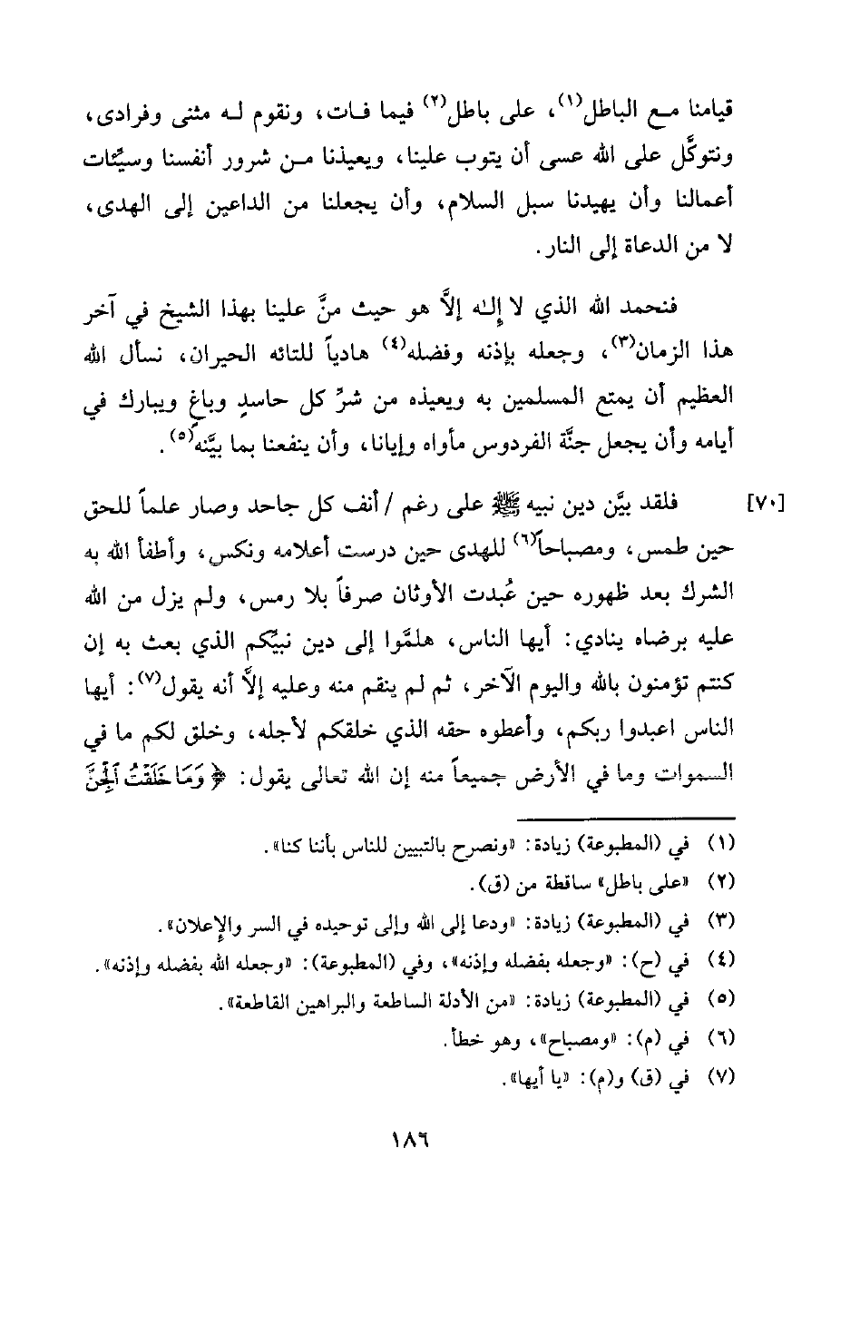 قيامنا مع الباطل (¬1) على باطل (¬2) فيما فات، ونقوم له مثنى وفرادى، ونتوكل على الله عسى أن يتوب علينا، ويعيذنا من شرور أنفسنا وسيئات أعمالنا وأن يهيدنا سبل السلام، وأن يجعلنا من الداعين إلى الهدى، لا من الدعاة إلى النار. فنحمد الله الذي لا إله إلا هو حيث من علينا بهذا الشيخ في آخر هذا الزمان (¬3) وجعله بإذنه وفضله (¬4) هاديا للتائه الحيران، نسأل الله العظيم أن يمتع المسلمين به ويعيذه من شر كل حاسد وباغ ويبارك في أيامه وأن يجعل جنة الفردوس مأواه وإيانا، وأن ينفعنا بما بينه (¬5) فلقد بين دين نبيه صلى الله عليه وسلم على رغم أنف كل جاحد وصار علما للحق حين طمس، ومصباحا (¬6) للهدى حين درست أعلامه ونكس، وأطفأ الله به الشرك بعد ظهوره حين عبدت الأوثان صرفا بلا رمس، ولم يزل من الله عليه برضاه ينادي: أيها الناس، هلموا إلى دين نبيكم الذي بعث به إن كنتم تؤمنون بالله واليوم الآخر، ثم لم ينقم منه وعليه إلا أنه يقول: (¬7) أيها الناس اعبدوا ربكم، وأعطوه حقه الذي خلقكم لأجله، وخلق لكم ما في السماوات وما في الأرض جميعا منه إن الله تعالى يقول: {وَمَا خَلَقْتُ الْجِنَّ وَالْإِنْسَ (¬8) إِلَّا لِيَعْبُدُونِ} [الذاريات: 56]